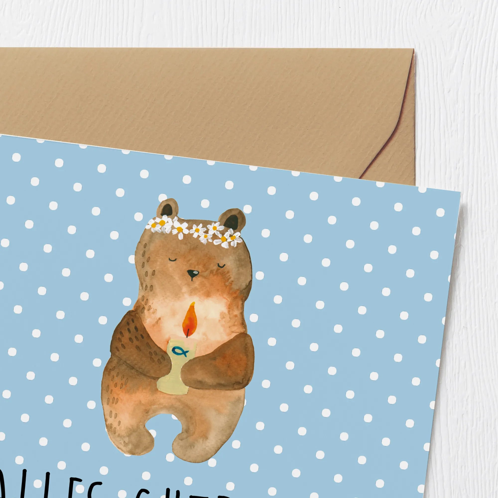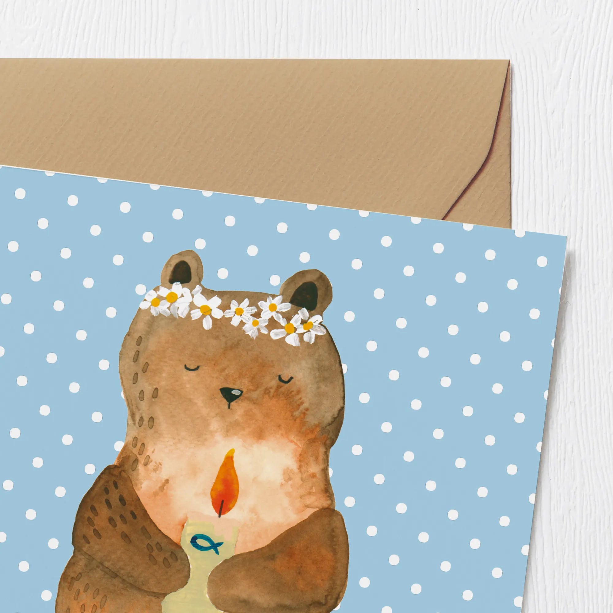 Die Deluxe Karte "Kommunion-Bär" aus der zauberhaften Bärenkollektion von Mr. & Mrs. Panda ist das perfekte Geschenk für diesen besonderen Anlass! Mit einem süßen Bären, der eine Kerze in der Hand hält und mit einer prachtvollen Blumenkrone geschmückt ist, bringt diese Karte Freude und Segenswünsche zu einem unvergesslichen Tag. Sie ist nicht nur eine wunderschöne Grußkarte, sondern auch ein wertvolles Erinnerungsstück zur Kommunion deines Kindes.