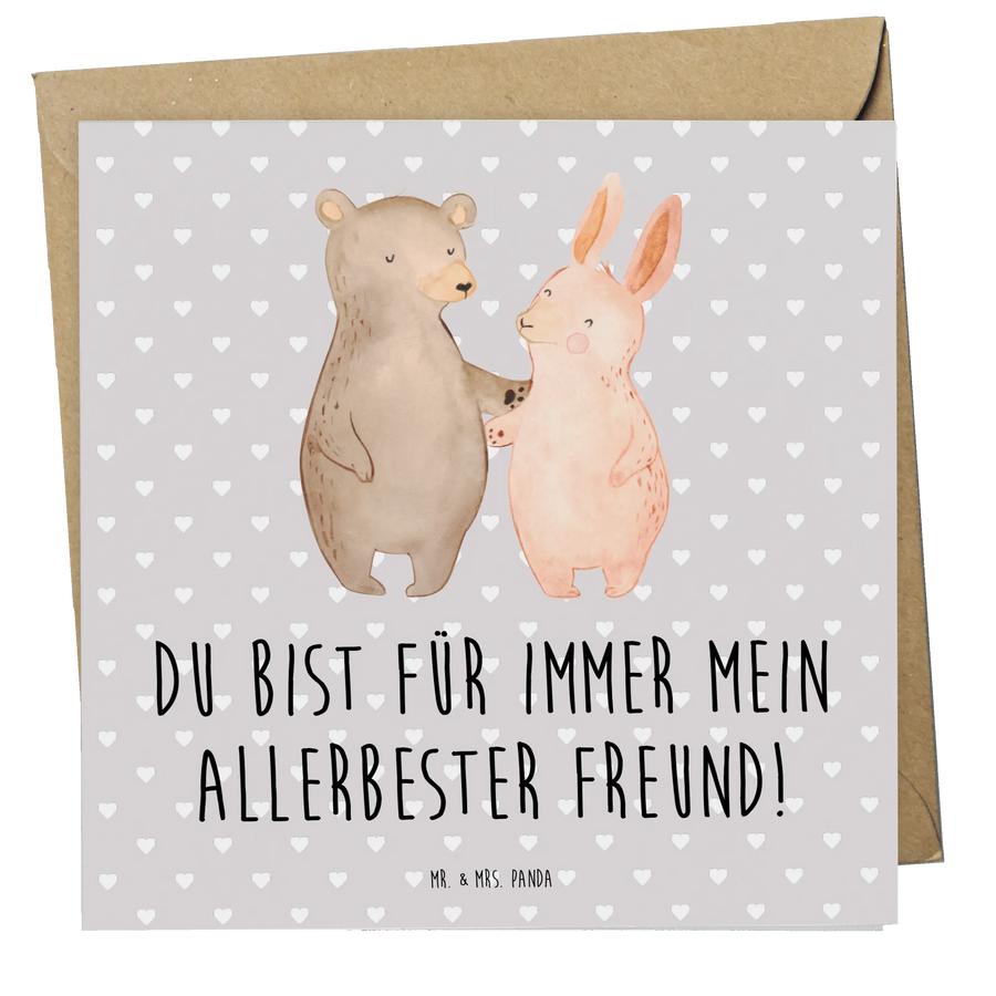 Unsere liebevoll illustrierte Grußkarte zeigt einen Bären und einen Hasen in inniger Umarmung – gezeichnet in sanften Aquarelltönen. Auf der Vorderseite steht der herzliche Spruch: „Du bist für immer mein allerbester Freund!" Perfekt für alle, die Gefühlen Ausdruck verleihen möchten.