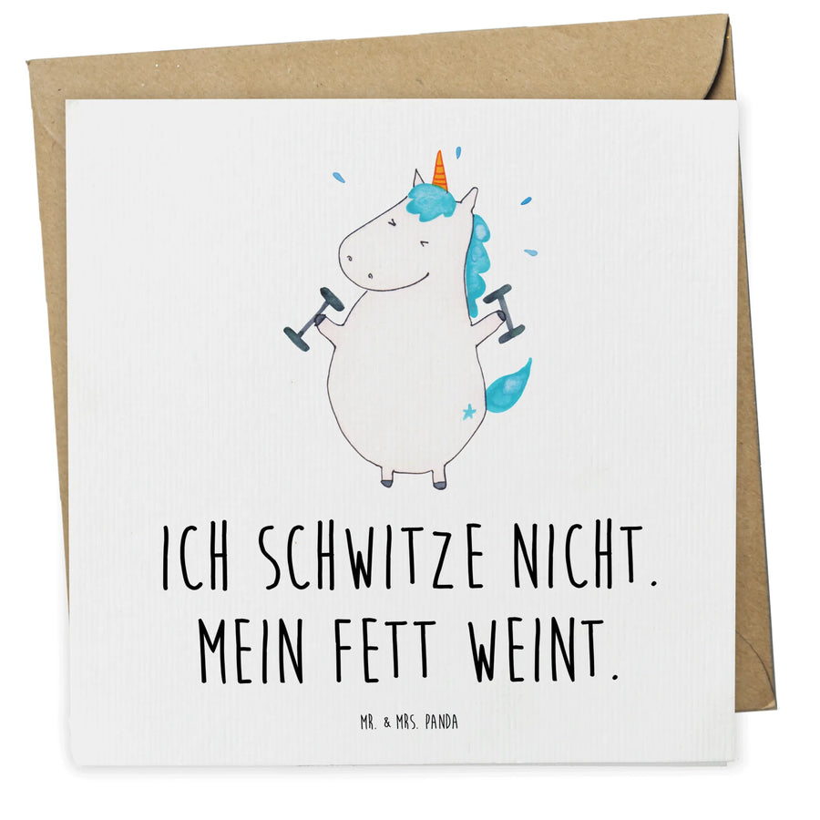 Die Deluxe Karte Einhorn Fitness von Mr. & Mrs. Panda ist das perfekte Geschenk für alle, die das Fitnessstudio lieben oder sich einfach motivieren wollen! Mit einem schönen, handgezeichneten Motiv eines süßen Einhorns, das fröhlich mit zwei Hanteln trainiert, zaubert diese Karte jedem Fitness-Fan ein Lächeln ins Gesicht. Der humorvolle Spruch „Ich schwitze nicht. Mein Fett weint.“ spricht besonders die sportbegeisterten Menschen an, die oft strengen Diäten folgen und für die jeder kleine Fortschritt gefeiert werden sollte.