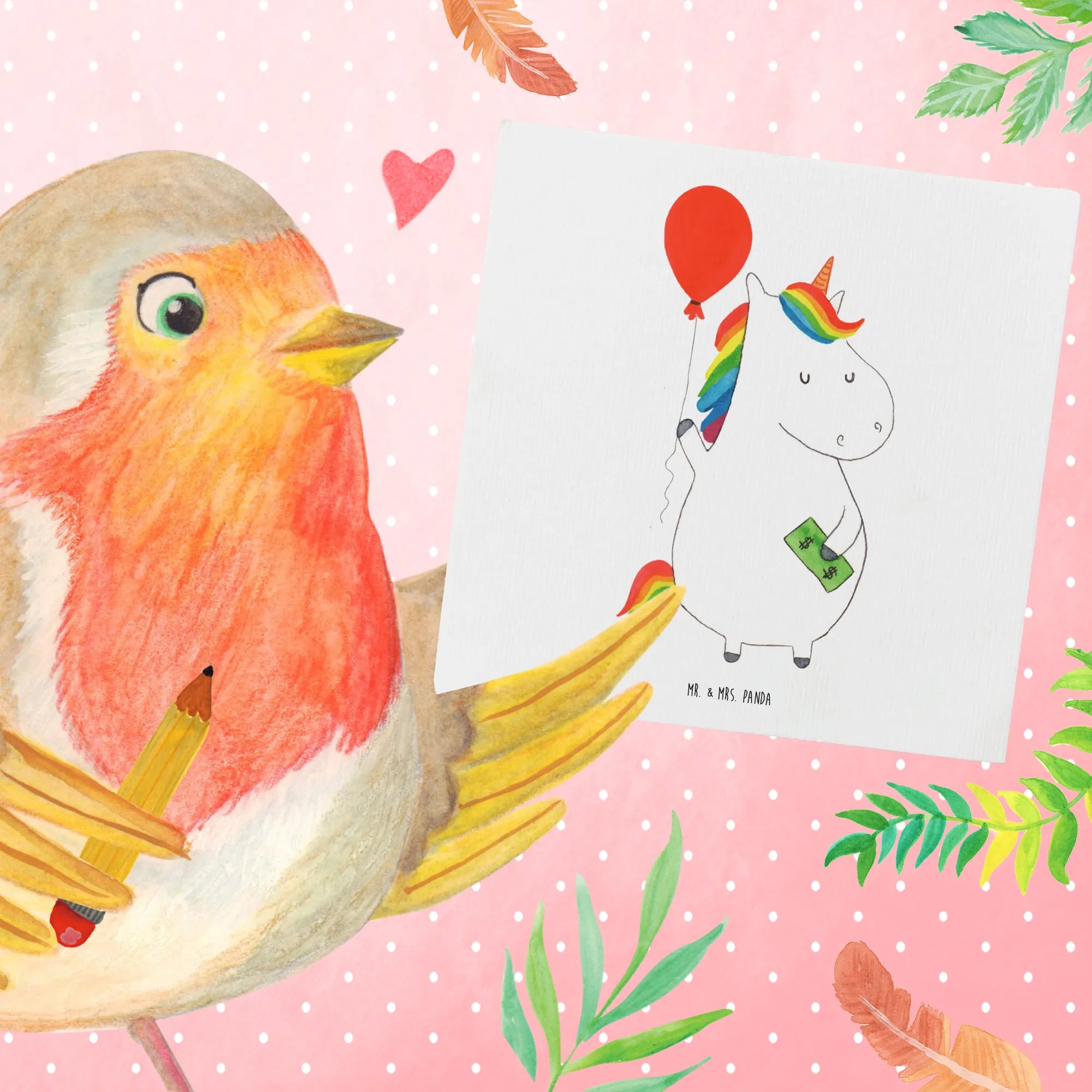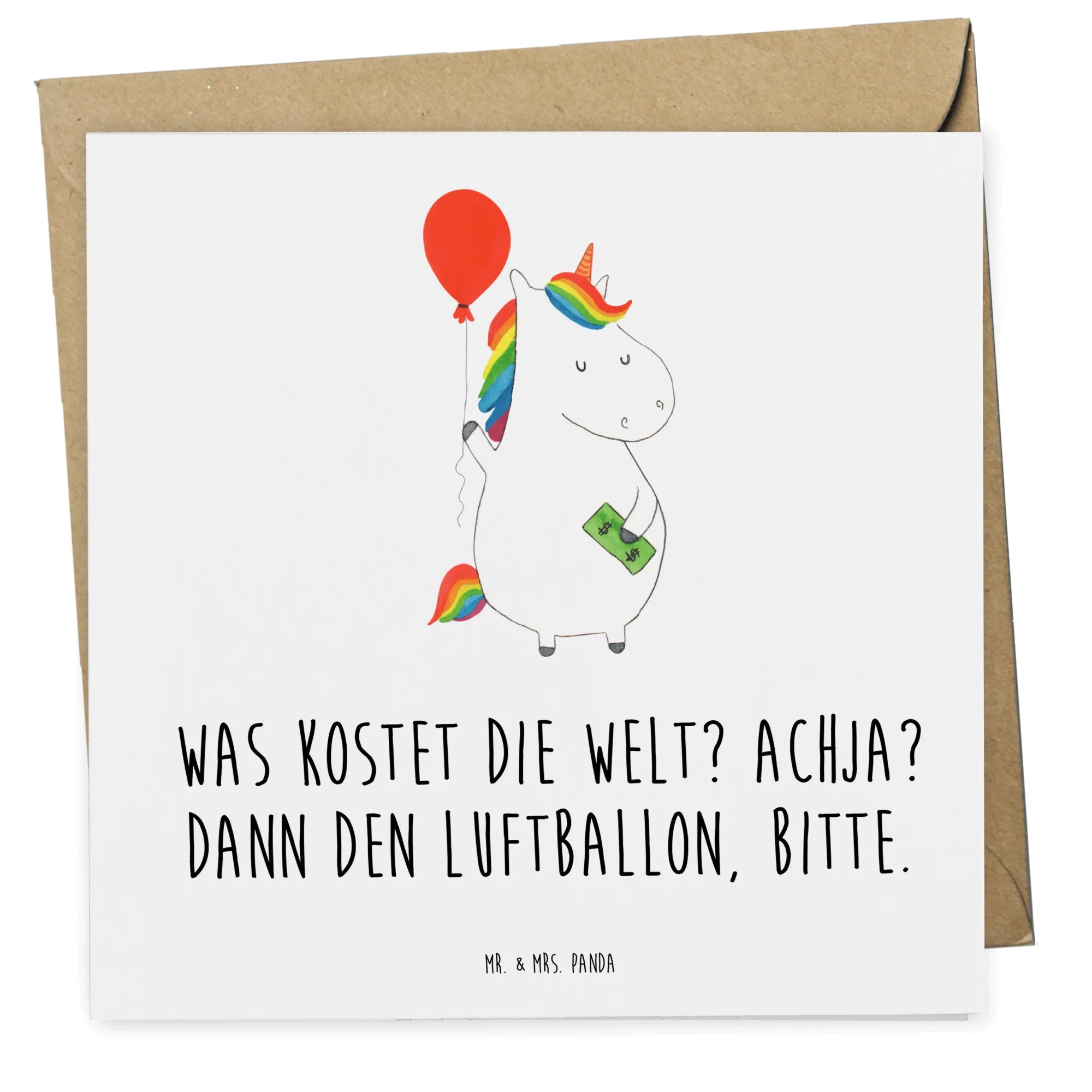 Das Motiv zeigt ein liebevoll handgezeichnetes Einhorn, das mit einem Luftballon in der einen Hand und Geldscheinen in der anderen Hand fröhlich lächelt und dich mit dem Spruch "Was kostet die Welt? Achja? Dann den Luftballon, bitte." in ein Lächeln versetzt. Egal, ob du diese Karte für Geburtstage, Hochzeiten, Verabschiedungen oder Jubiläen benötigst – mit dieser Karte machst du jedem eine Freude!
