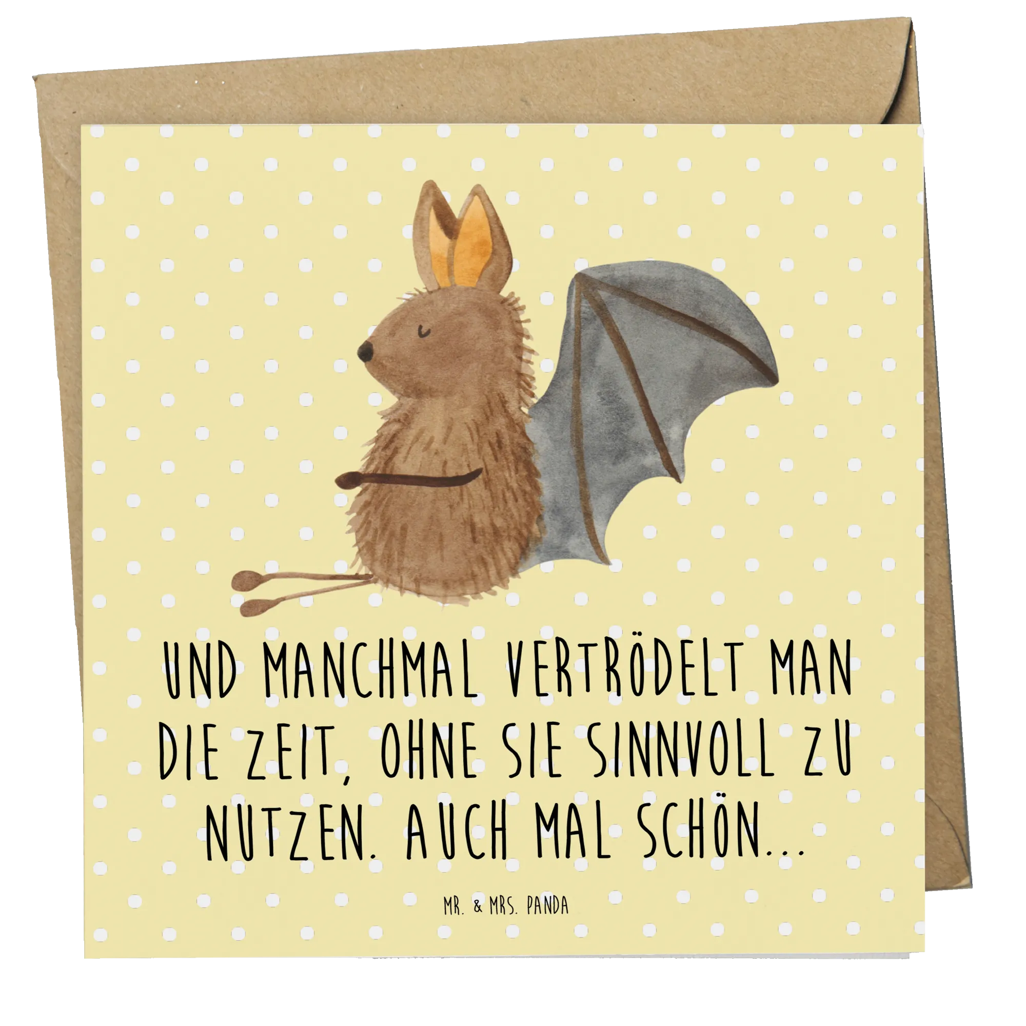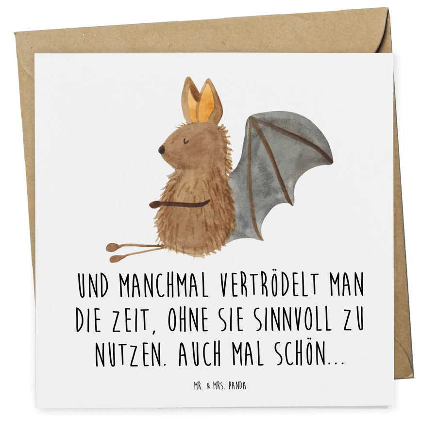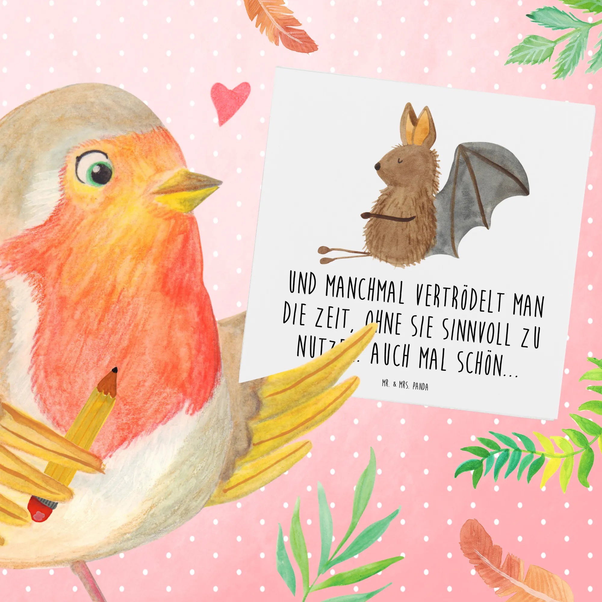 Vergiss die Hektik des Alltags und lass dich von unserer Fledermaus in eine Welt der Entspannung entführen. Dargestellt in einer Pose der Ruhe, erinnert uns dieses Motiv daran, wie wichtig es ist, auch mal innezuhalten. Der beigefügte Spruch „Und manchmal vertrödelt man die Zeit, ohne sie sinnvoll zu nutzen. Auch mal schön...“, unterstützt die Botschaft des Bildes auf wundervolle Weise. Er spricht von der Schönheit des Moments, in dem man sich erlaubt, einfach zu sein. Dieses Motiv von Mr. & Mrs. Panda lädt dich ein, dein Leben auch mal langsamer anzugehen und die kleinen Freuden zu genießen, die ein Moment der Ruhe birgt.
