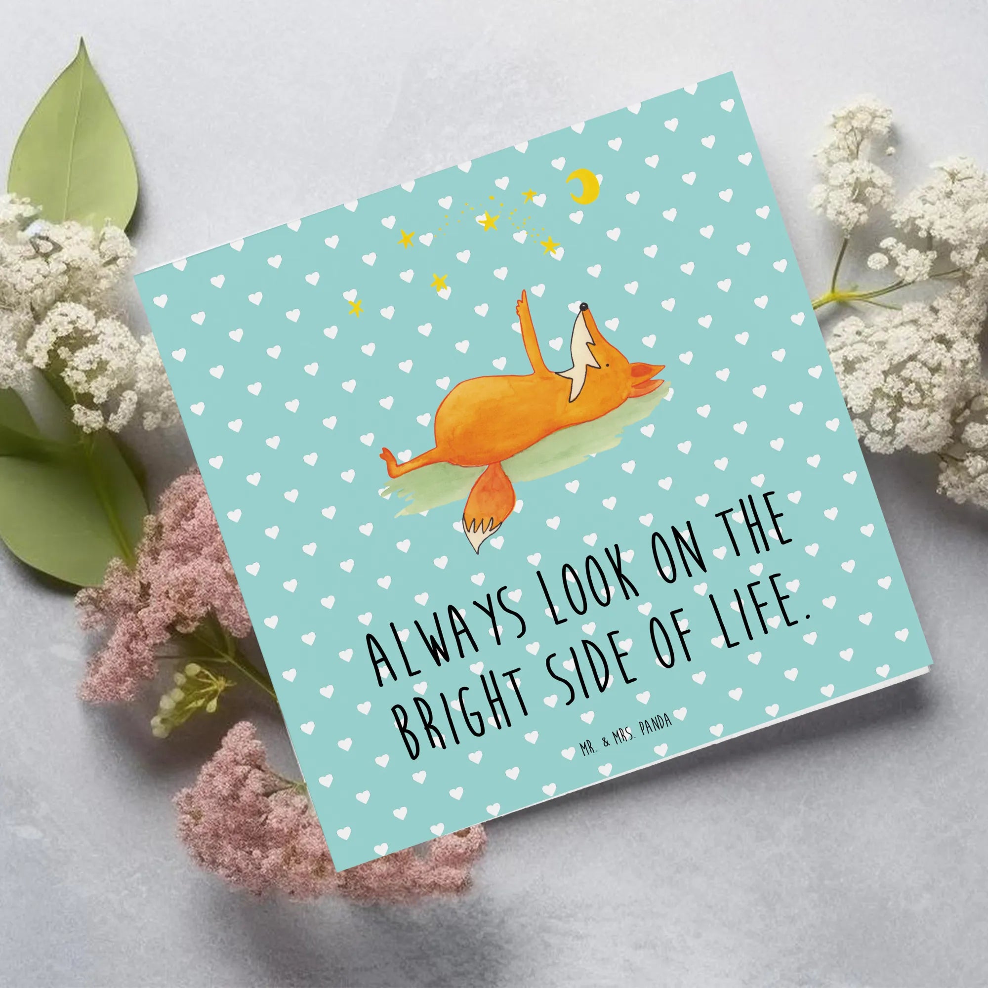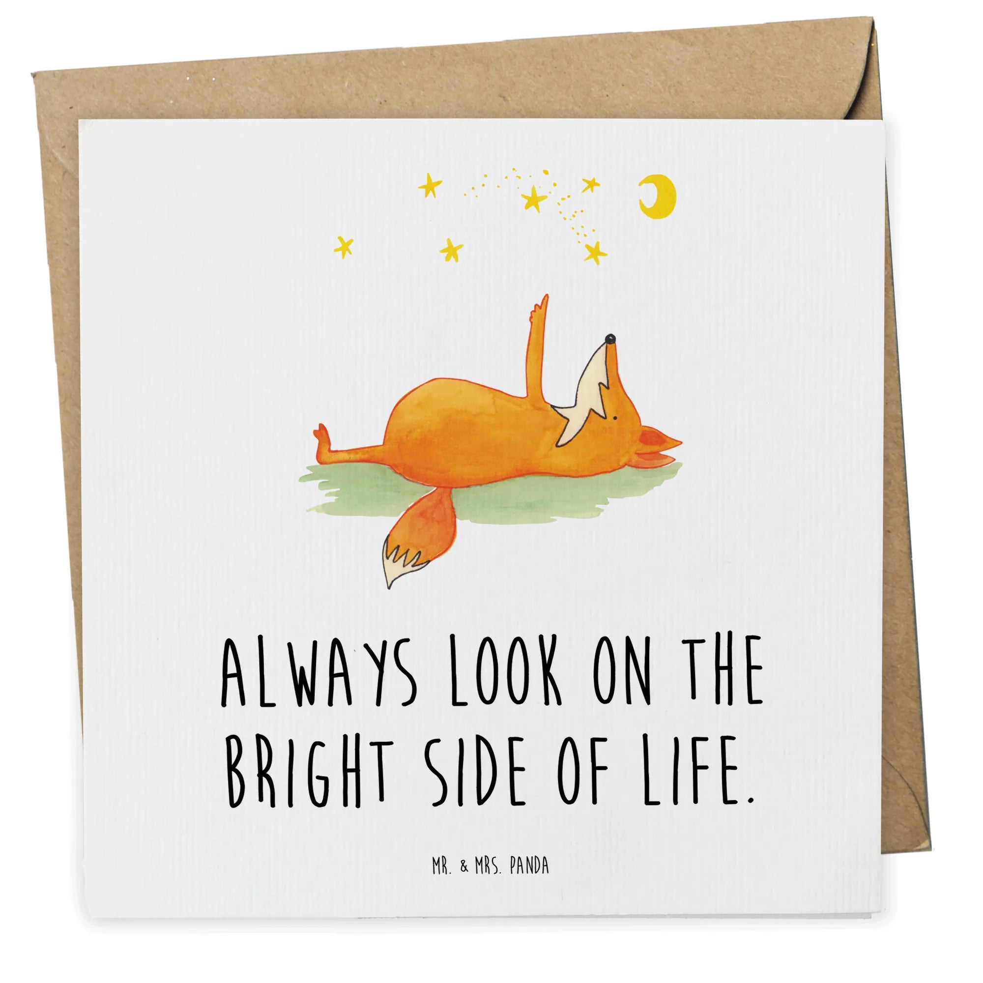 Diese hochwertige, quadratische Grußkarte zeigt einen niedlichen Fuchs, der auf dem Rücken liegt und verträumt in den Sternenhimmel schaut. Das Motiv ist liebevoll von Mrs. Panda mit Aquarell gefertigt und versprüht sofort Romantik, Zuversicht und Wärme. Perfekt als Hochzeitskarte, Geburtstagskarte, Glückwunschkarte oder als kleine Aufmunterung zwischendurch.