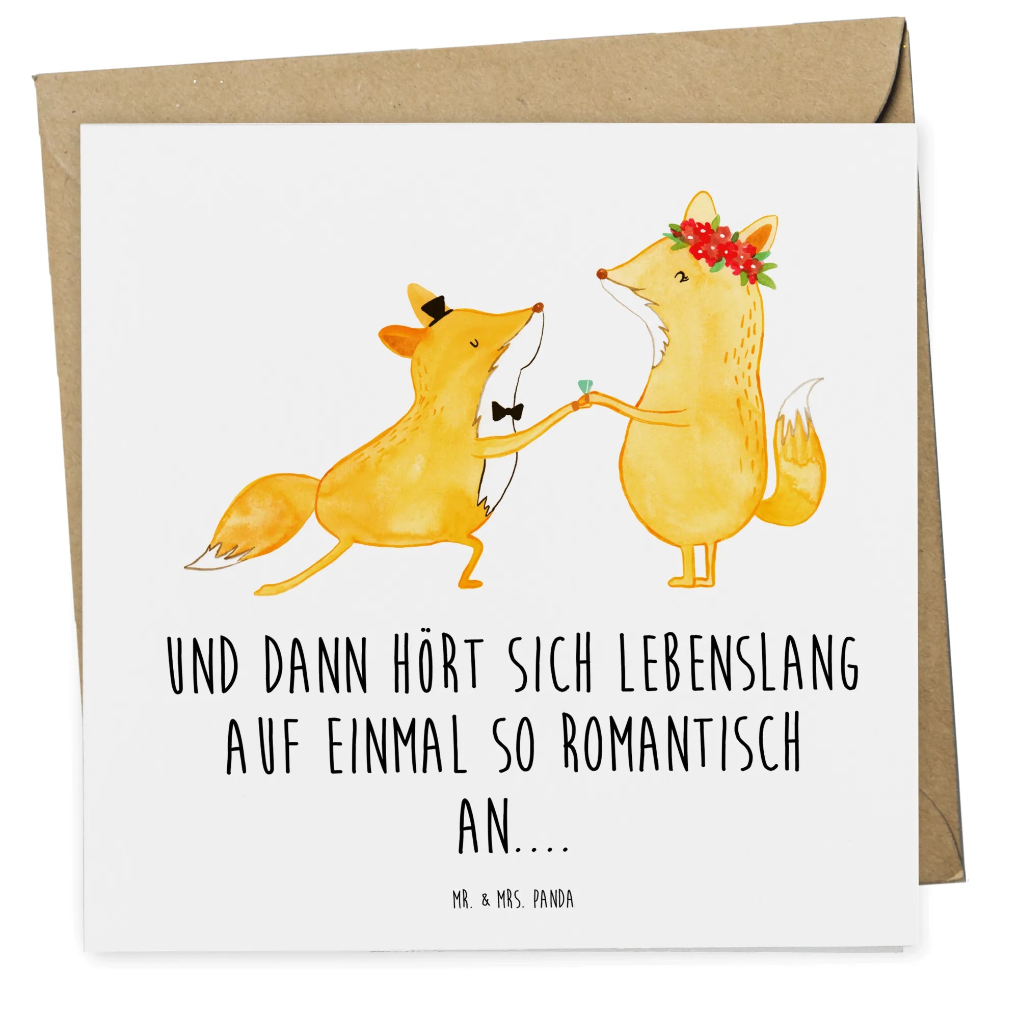 Die Karte misst 140 mm x 140 mm und kommt auf edlem, mattem Karton mit einer hochglänzend veredelten Vorderseite, die das wunderschöne Aquarellmotiv von einem Fuchs Männchen, das um die Hand seiner Fuchs Dame anhält, perfekt zur Geltung bringt. "Und dann hört sich lebenslang auf einmal so romantisch an...." - dieser liebevolle Slogan bringt die Magie des Moments perfekt auf den Punkt.