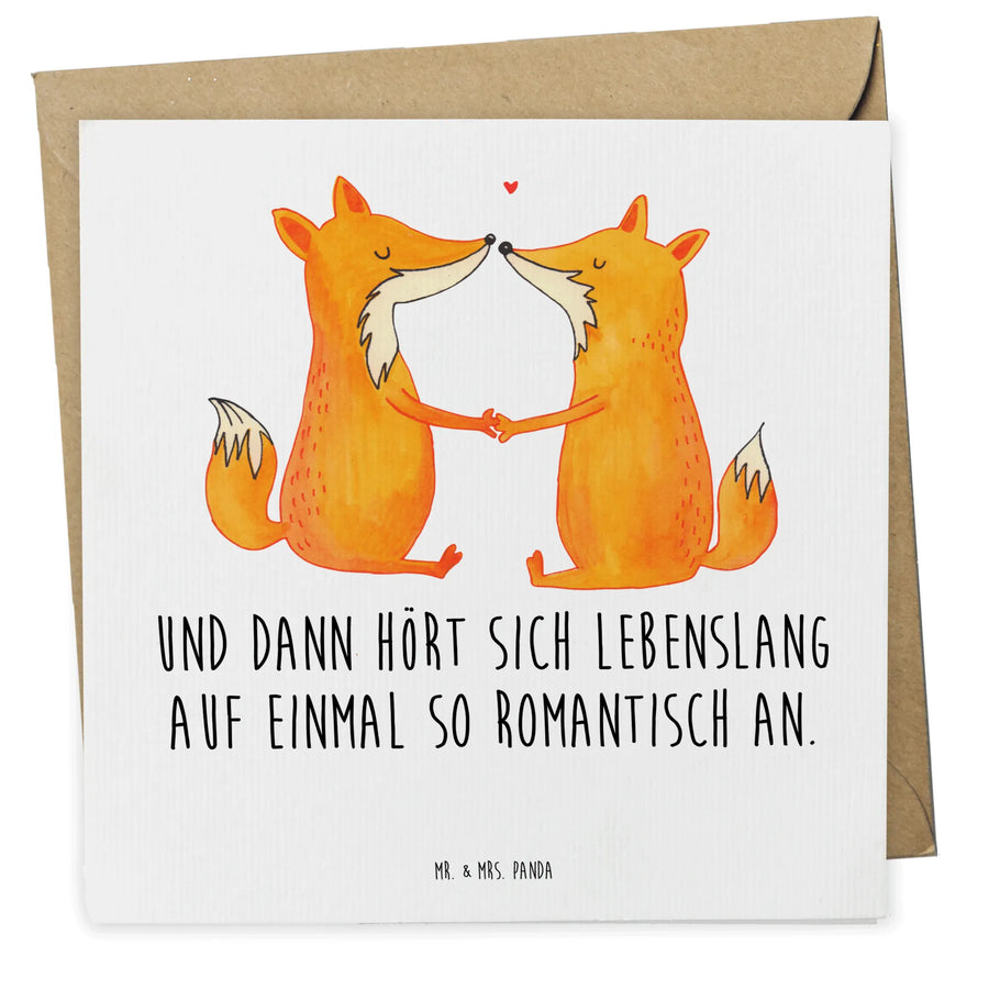 Mit zarten, handgezeichneten Füchsen, die Hand in Hand sitzen und eine unendliche Verbundenheit ausstrahlen, zaubert diese Karte jedem ein Lächeln ins Gesicht. Ob als Einladungskarte zu einer Hochzeit oder als Glückwunschkarte zu einem Geburtstag – sie passt perfekt für jeden festlichen Anlass. Der Spruch "Und dann hört sich lebenslang auf einmal so romantisch an." verleiht dieser Karte eine besondere Note.