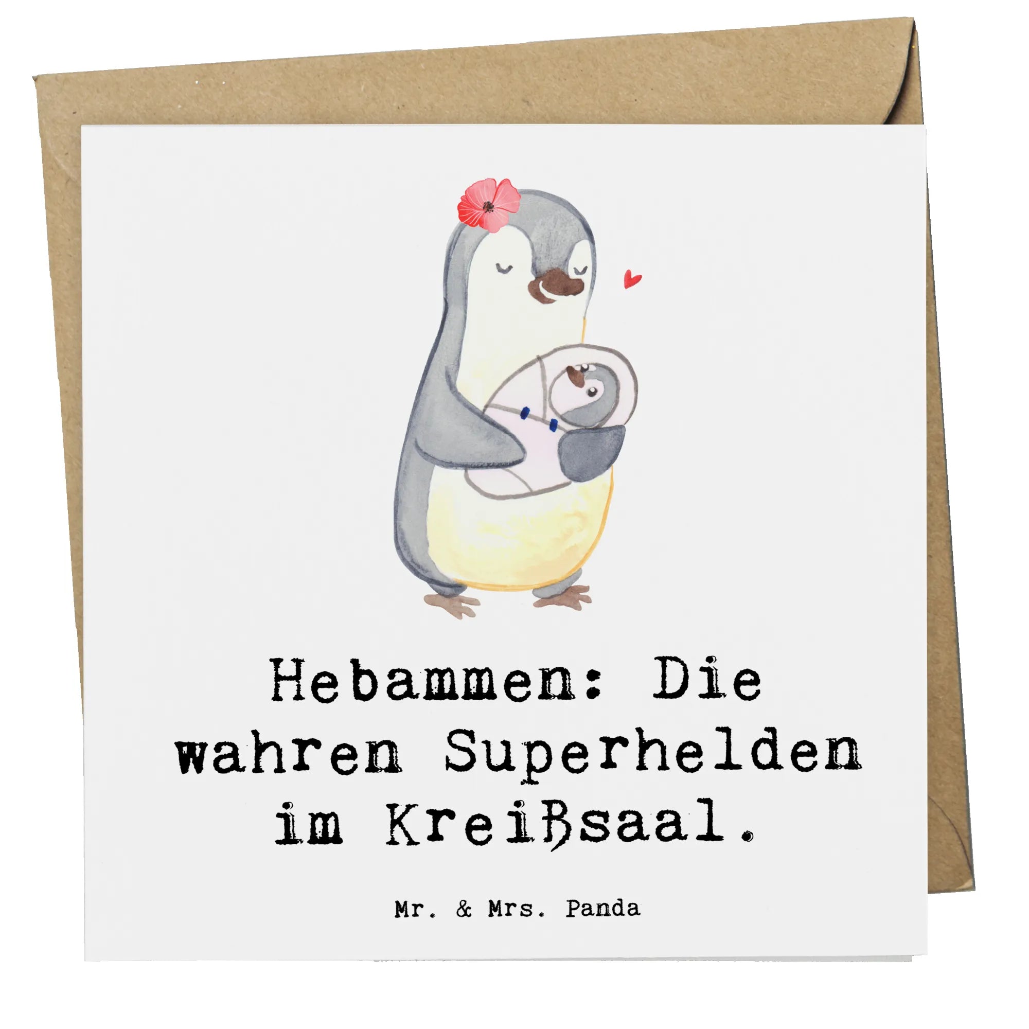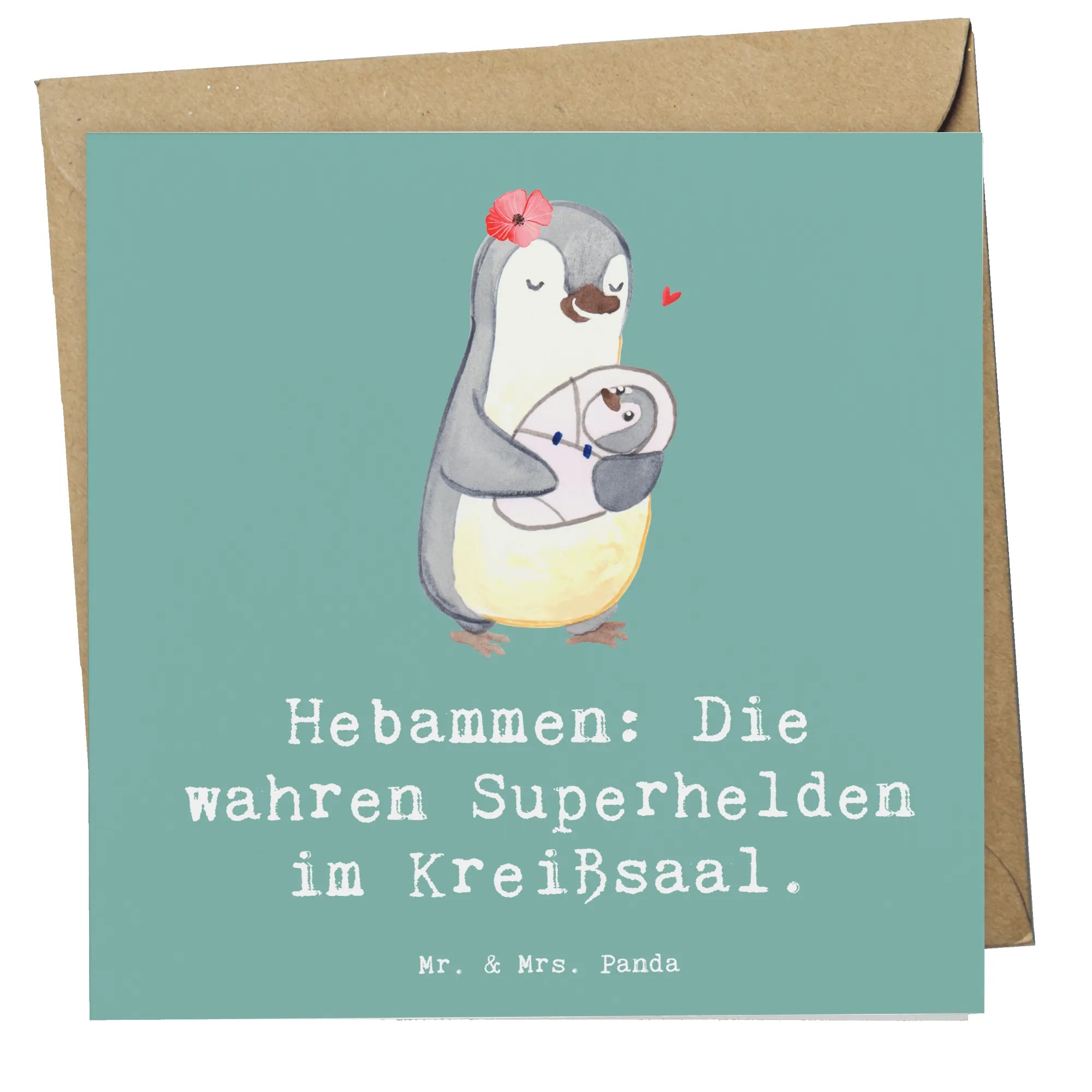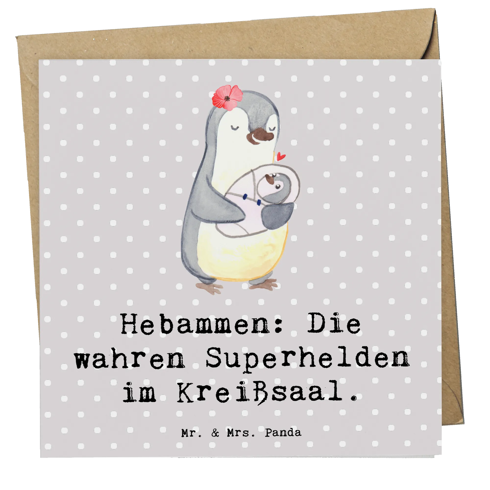 Die Deluxe Karte mit dem Motiv 'Hebamme: Die wahren Superhelden im Kreißsaal.' aus der Mr. & Mrs. Panda Berufe Kollektion ist das perfekte Geschenk für alle, die sich in der Welt der Geburtshilfe engagieren oder solidarisch mit Hebammen sein möchten.