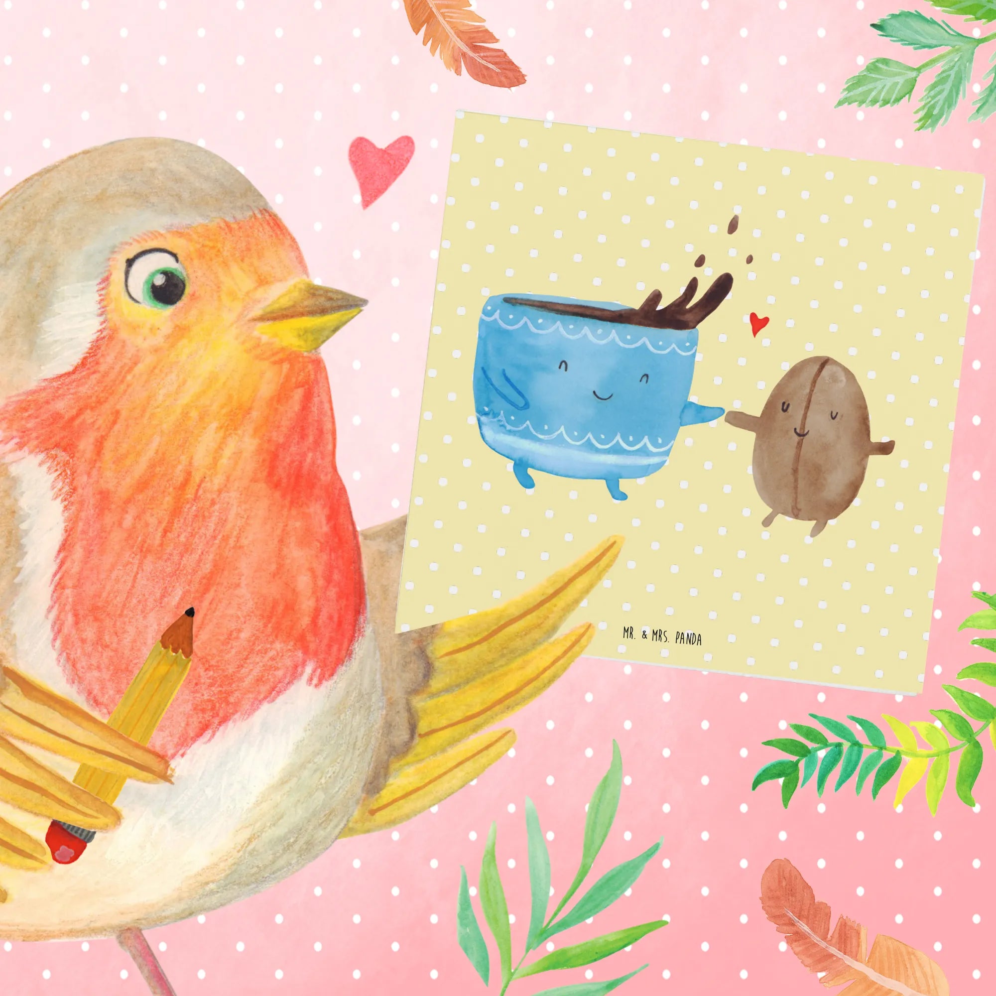 Das liebevoll gestaltete Motiv zeigt eine fröhliche Kaffeetasse, die stolz eine kleine Kaffeebohne in der Hand hält. Diese charmante Darstellung verkörpert die Freude am Kaffeegenuss und sorgt für gute Laune. Die Kaffeetasse hat strahlende Augen und vermittelt das Gefühl von Zufriedenheit und Glück. Jedes Detail der Zeichnung wurde von Mrs. Panda mit Liebe zum Detail gestaltet und auf hochwertigem 300 Gramm Karton in edler Optik gedruckt.