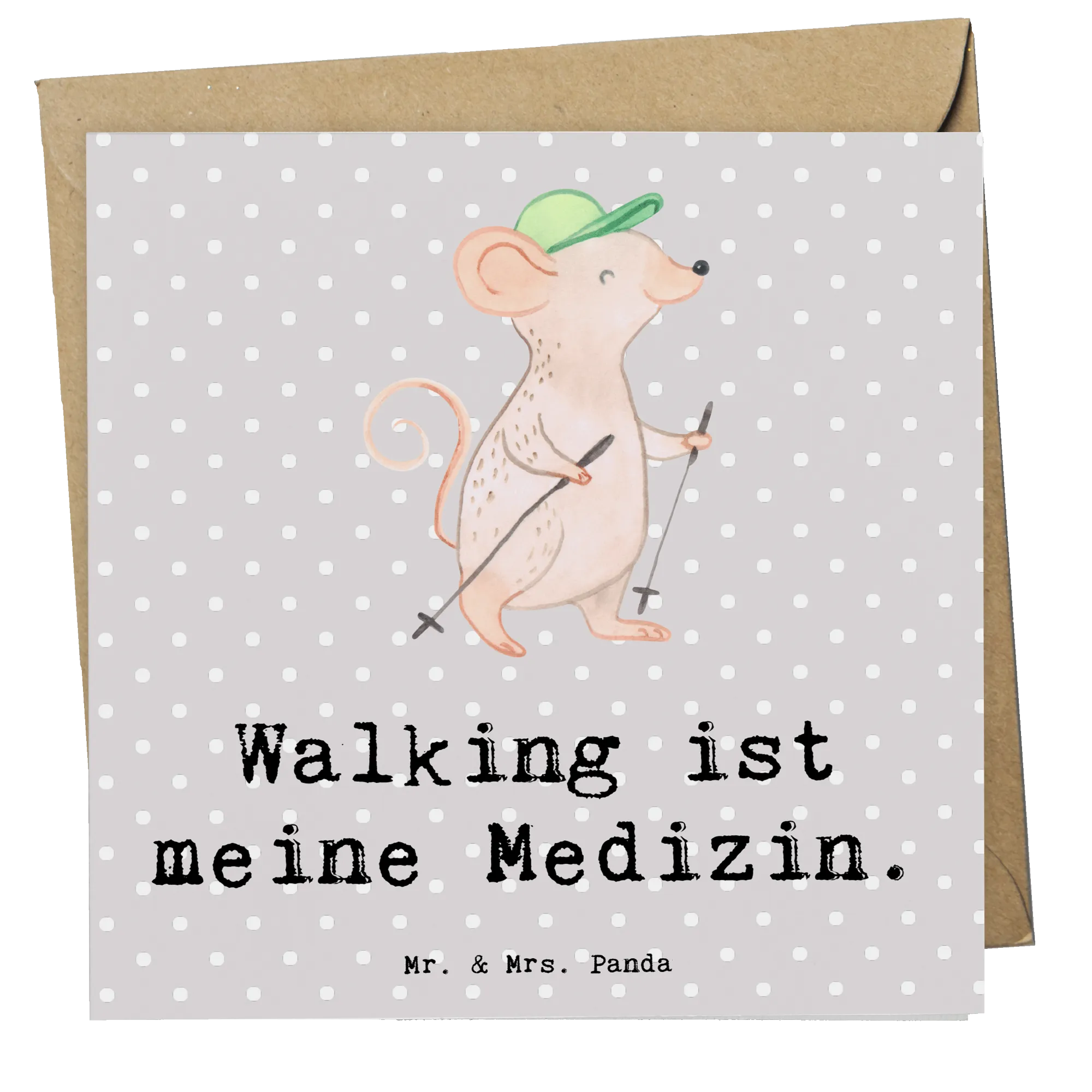 Die Vorderseite der Karte zeigt eine süße Maus mit Käppi, die voller Lebensfreude mit ihren Walkingstöcken einen großen Spaziergang macht. Der Slogan 'Walking ist meine Medizin' spielt humorvoll auf die positiven Effekte des Gehens an und ist eine wunderschöne Botschaft für Sport- und Naturbegeisterte.