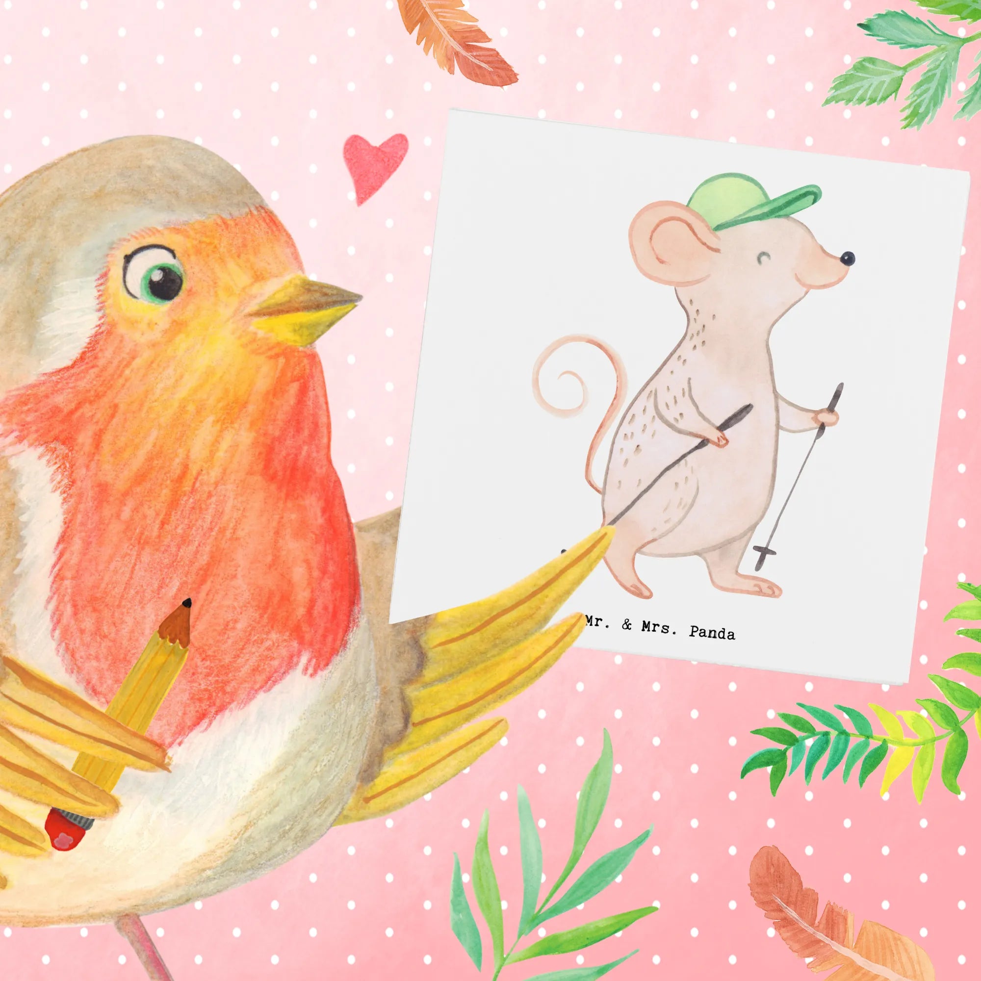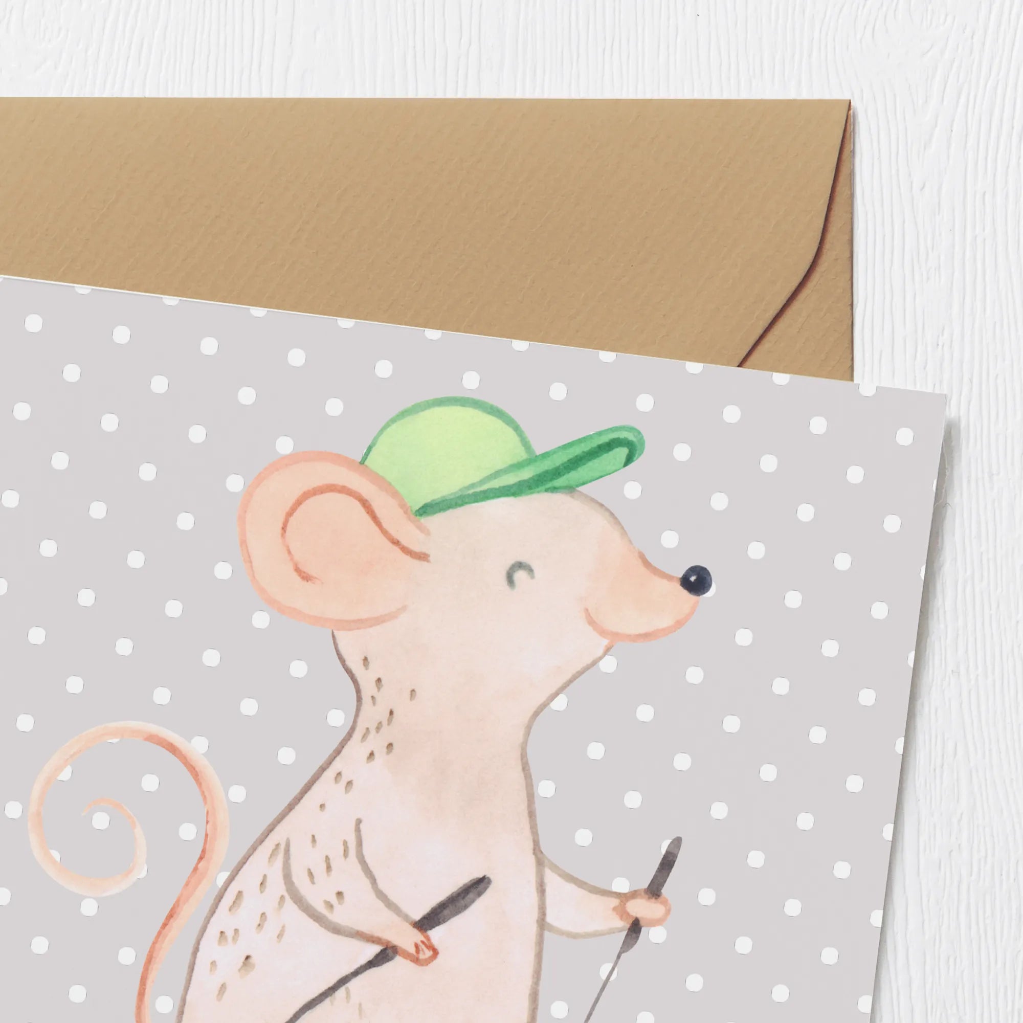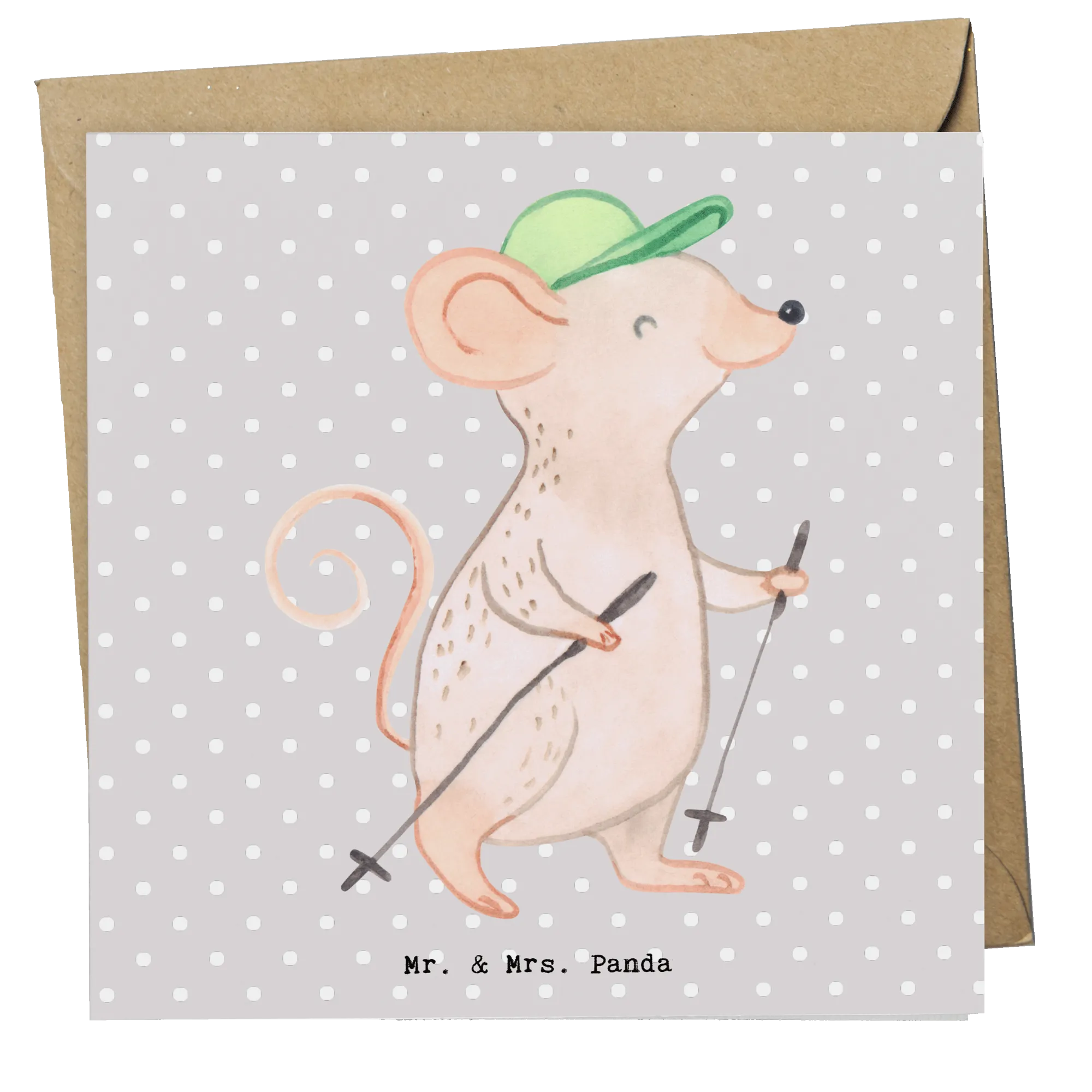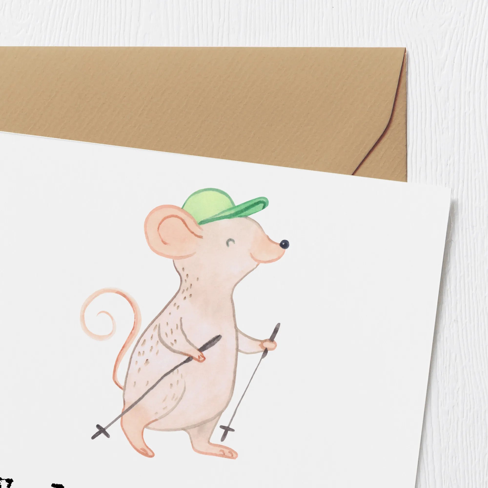 Auf der Vorderseite der Karte findest du die niedliche Maus mit Käppi, die mit Walkingstöcken einen großen Spaziergang macht – ein echtes Motiv für Sport- und Hobby-Enthusiasten!