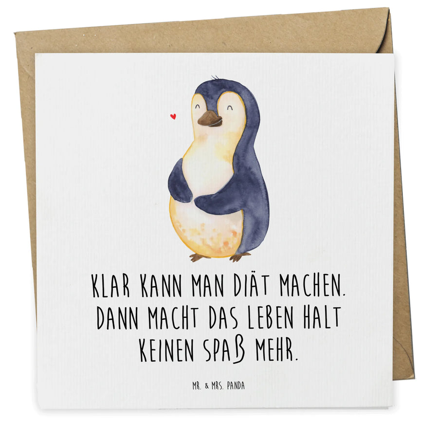 Der fröhliche Pinguin auf der Karte streicht sich über seinen dicken Bauch und erinnert uns daran, dass das Leben auch ohne strenge Diäten voller Freude und Zufriedenheit sein kann. Mit dem Slogan "Klar kann man Diät machen. Dann macht das Leben halt keinen Spaß mehr." spricht unser Design nicht nur Herz und Verstand an, sondern regt auch zum Schmunzeln an.