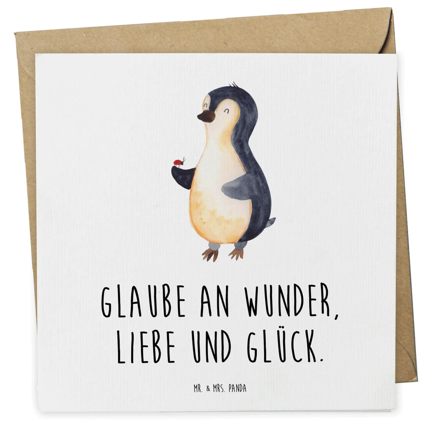 Hergestellt aus hochwertigem 300 Gramm Karton, überzeugt die Karte durch ihre edle Optik und die besonderen Details wie die hochglänzend veredelte Vorderseite. Der süße Pinguin, der einen fröhlichen Marienkäfer auf seiner Flosse hält, wird dich und deine Lieben verzaubern. Er steht für die Botschaft: 'Glaube an Wunder, Liebe und Glück'. Diese positive Einstellung spiegelt sich in jedem Design von Mr. & Mrs. Panda wider und sorgt nicht nur für eine tolle Optik, sondern vermittelt auch eine wunderbare Botschaft.