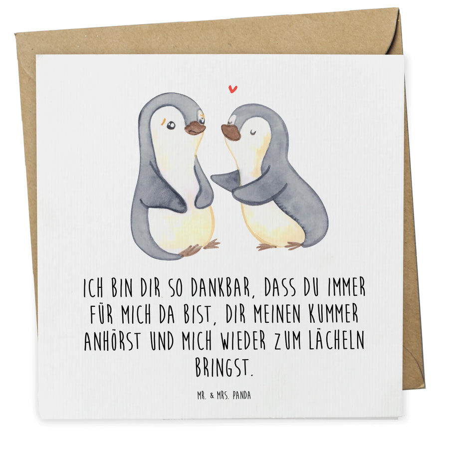 Die Deluxe Karte "Pinguine trösten" von Mr. & Mrs. Panda ist das perfekte Geschenk für alle, die ihren Liebsten eine besondere Freude machen möchten. Diese hochwertige, quadratische Grußkarte im Format 140 mm x 140 mm ist nicht nur durch ihr süßes Motiv, sondern auch durch den einfühlsamen Spruch verziert: "Ich bin dir so dankbar, dass du immer für mich da bist, dir meinen Kummer anhörst und mich wieder zum Lächeln bringst."