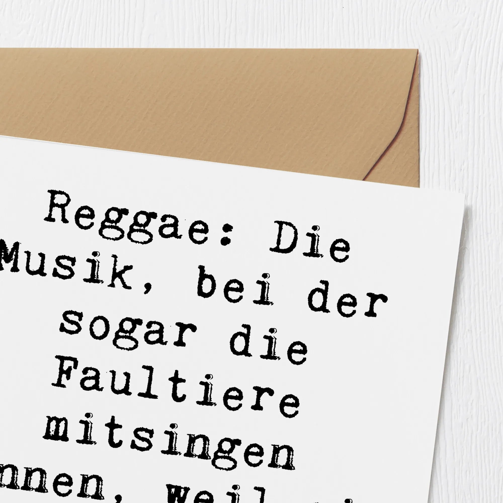 Auf der Vorderseite prangt der beschwingte Spruch: "Reggae: Die Musik, bei der sogar die Faultiere mitsingen können, weil sie schnell genug sind." Ein Spruch, der die Lebensfreude und den entspannten Lebensstil des Reggae perfekt widerspiegelt. Die matte Innenseite der Karte bietet ausreichend Platz, um deine herzlichsten Botschaften zu hinterlassen. Dieser besondere Kranz an Farben und positiven Schwingungen macht diese Glückwunschkarte zu einem echten Highlight und sorgt dafür, dass sie einen besonderen Platz im Herzen des Beschenkten einnimmt.
