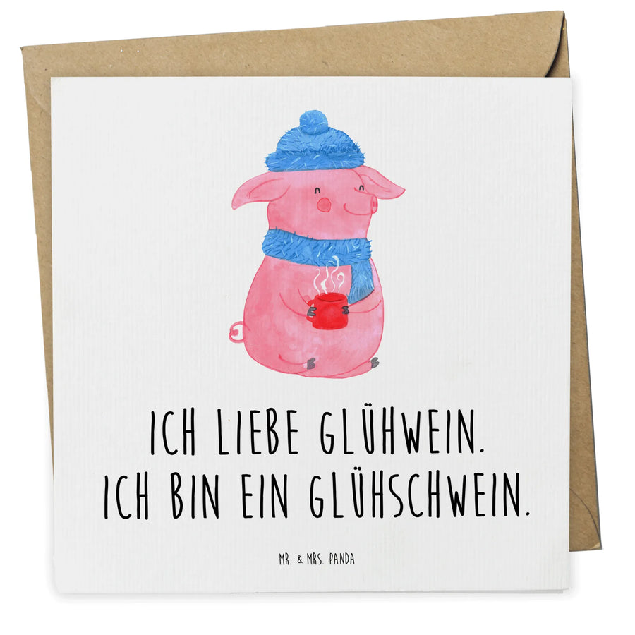 Die Deluxe Karte "Glühschwein" aus der Winter Kollektion von Mr. & Mrs. Panda ist das perfekte Geschenk für alle, die die festliche Zeit lieben und gerne ihre Liebe zu Glühwein zeigen möchten. Diese wunderschöne quadratische Karte hat Maße von 140 mm x 140 mm und wird aus hochwertigem Karton mit einem Gewicht von 300 Gramm gefertigt. Mit ihrem fröhlichen Motiv zeigt sie ein niedliches, rosa Schweinchen in warmer Winterkleidung, das eine dampfende Tasse Glühwein hält. Der Spruch 'Ich liebe Glühwein. Ich bin ein Glühschwein.' bringt jeden zum Schmunzeln und versprüht weihnachtliche Vorfreude.