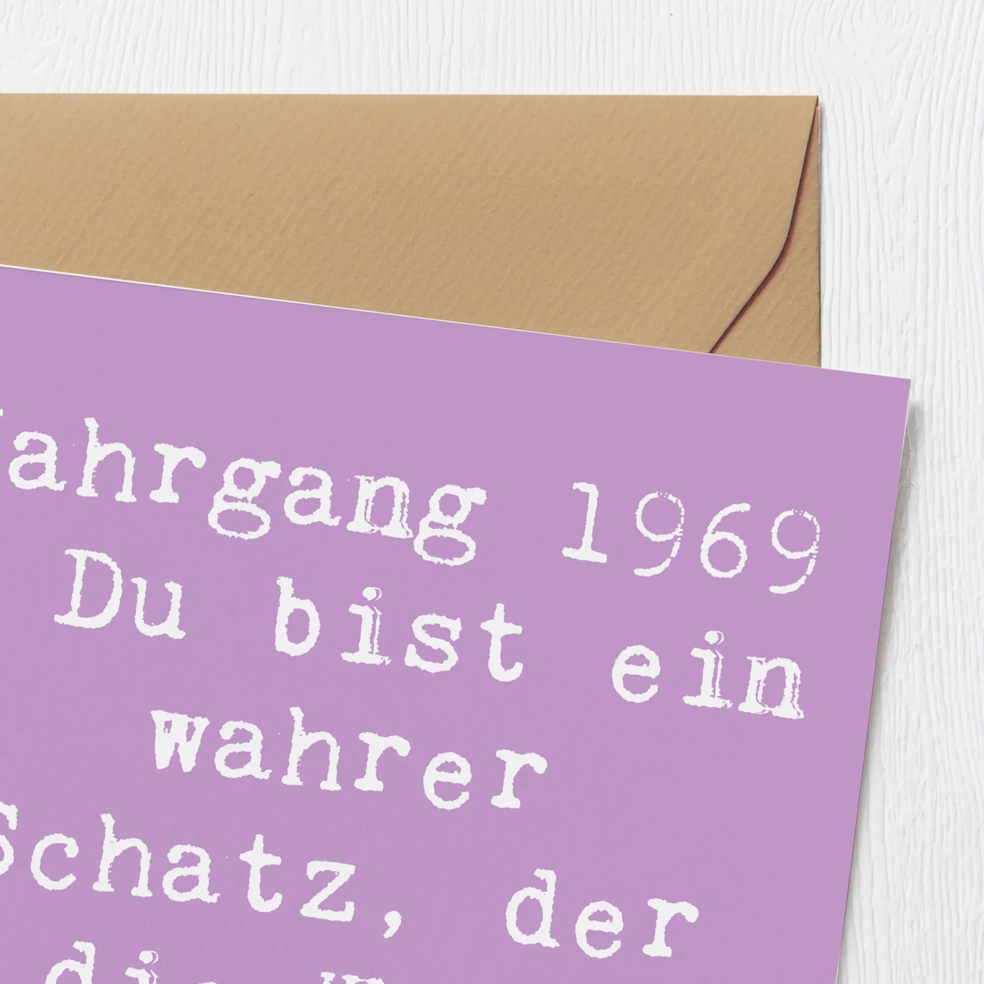 Auf der Karte prangt der herzliche Spruch: "Jahrgang 1969 - Du bist ein wahrer Schatz, der die Welt bereichert." Dies bietet eine persönliche Note, die das Geschenk noch besonderer macht. Unsere hochqualitative Klappkarte ist aus edlem 300 Gramm Karton gefertigt und überzeugt mit einem hochglänzend veredelten Design. Der matte Innenteil lädt dazu ein, eigene Grüße oder Wünsche kreativ zu hinterlassen.