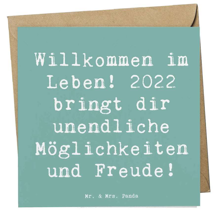 Die Karte ist mit dem Slogan "Willkommen im Leben! 2022 bringt dir unendliche Möglichkeiten und Freude!" bedruckt, was jedem Geburtstagskind nicht nur Glückwünsche, sondern auch eine positive Botschaft für das neue Lebensjahr vermittelt. Ihr hochwertiger Karton mit einer glanzvollen Vorderseite sowie einer matte Innenseite zur persönlichen Beschriftung unterstreicht den besonderen Anspruch von Mr. & Mrs. Panda an Qualität und Geschmack.