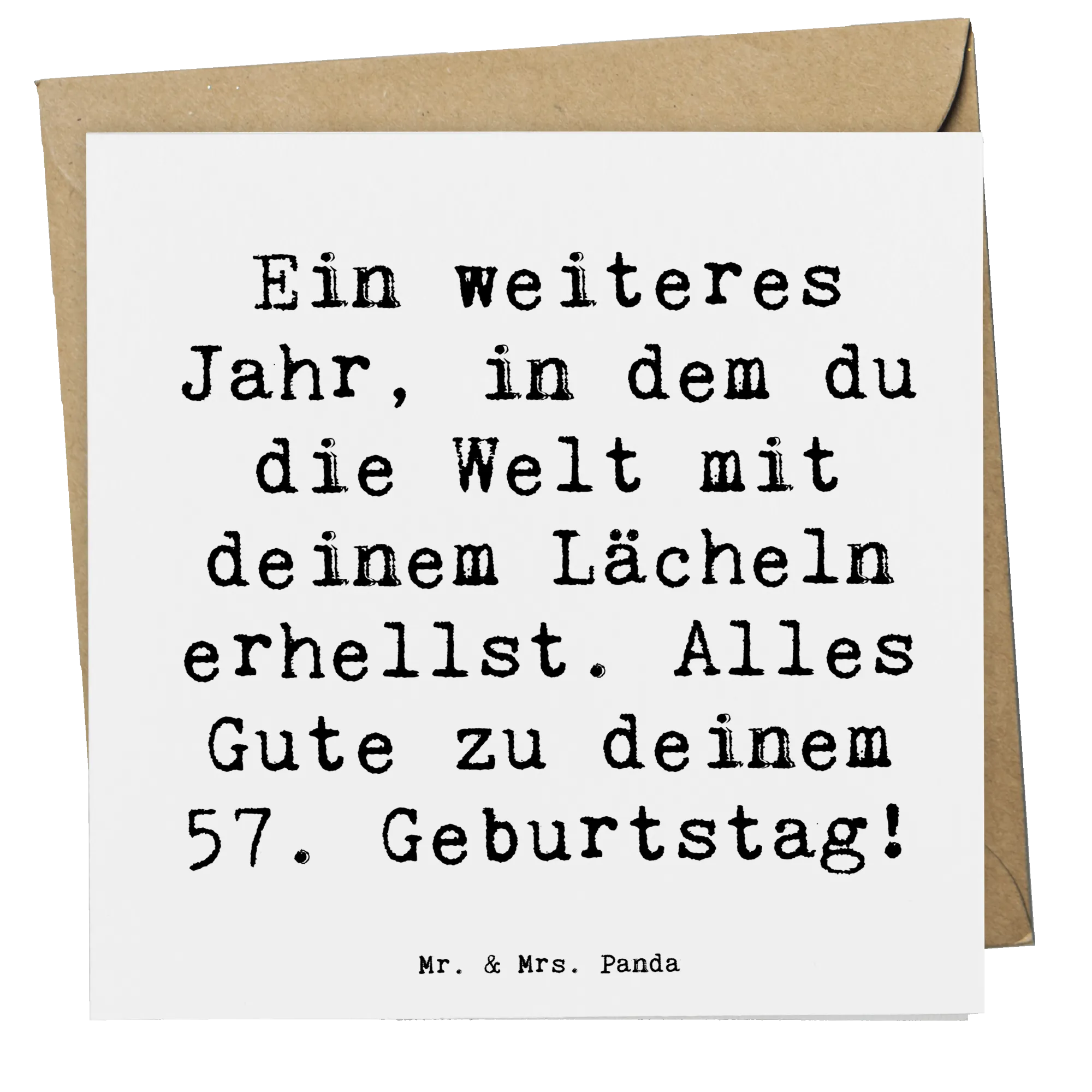Der liebevoll gestaltete Spruch auf der Vorderseite lautet: „Ein weiteres Jahr, in dem du die Welt mit deinem Lächeln erhellst. Alles Gute zu deinem 57. Geburtstag!“. Das fröhliche Design wird nicht nur dem Geburtstagskind ein Lächeln ins Gesicht zaubern, sondern auch bei den Gästen für gute Stimmung sorgen.