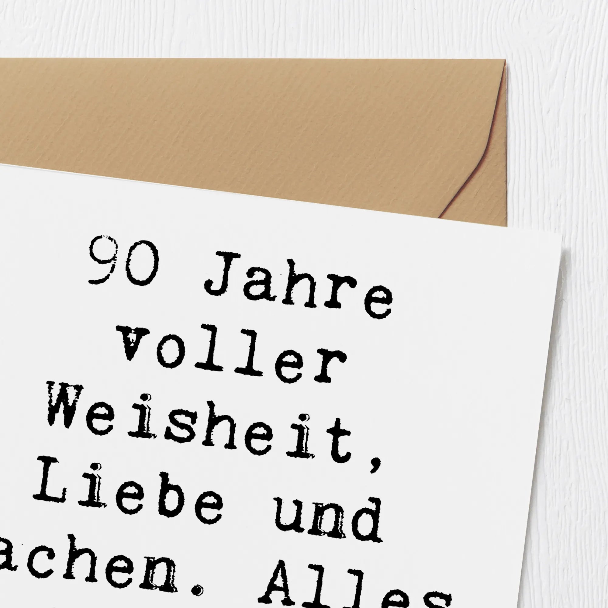 Die Vorderseite der Karte ist mit dem zauberhaften Spruch "90 Jahre voller Weisheit, Liebe und Lachen. Alles Gute zum Geburtstag!" versehen. Es ist ein wahres Highlight, das ein Lächeln ins Gesicht zaubert!