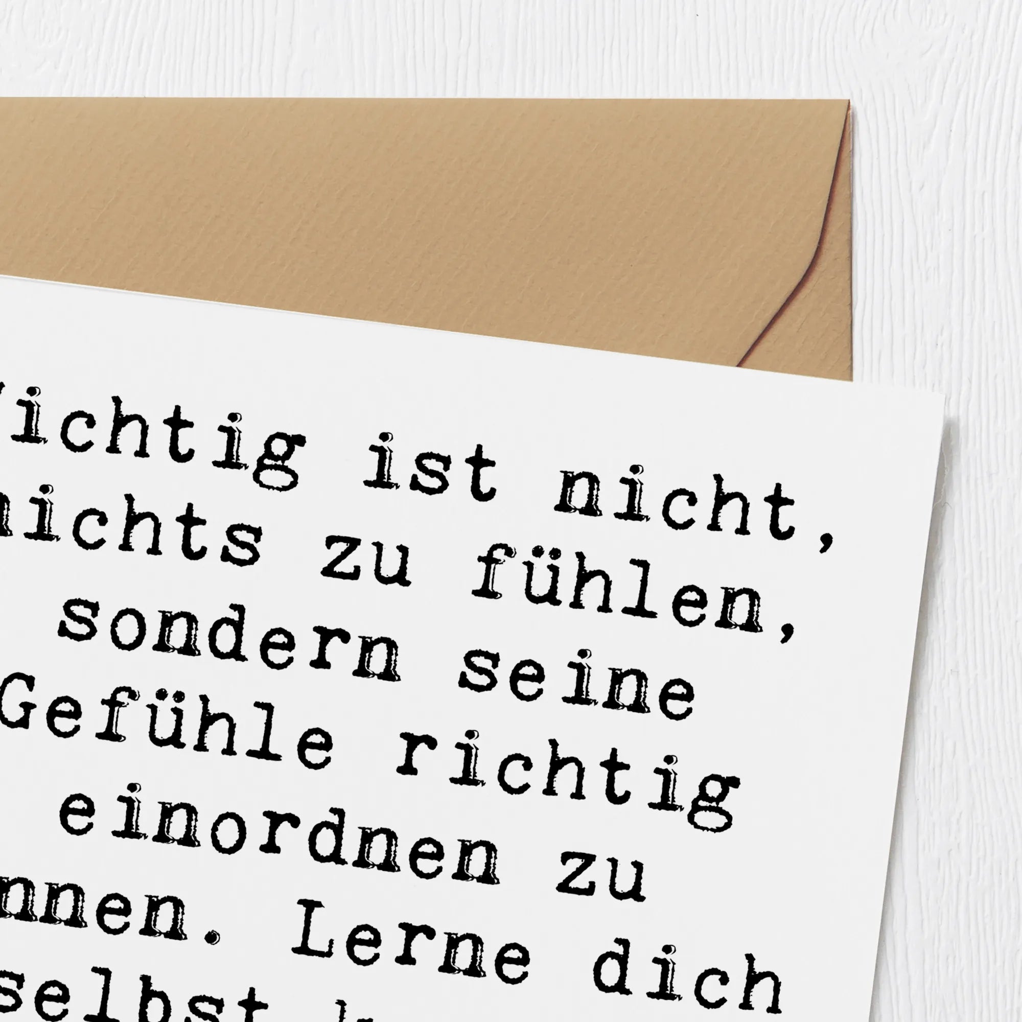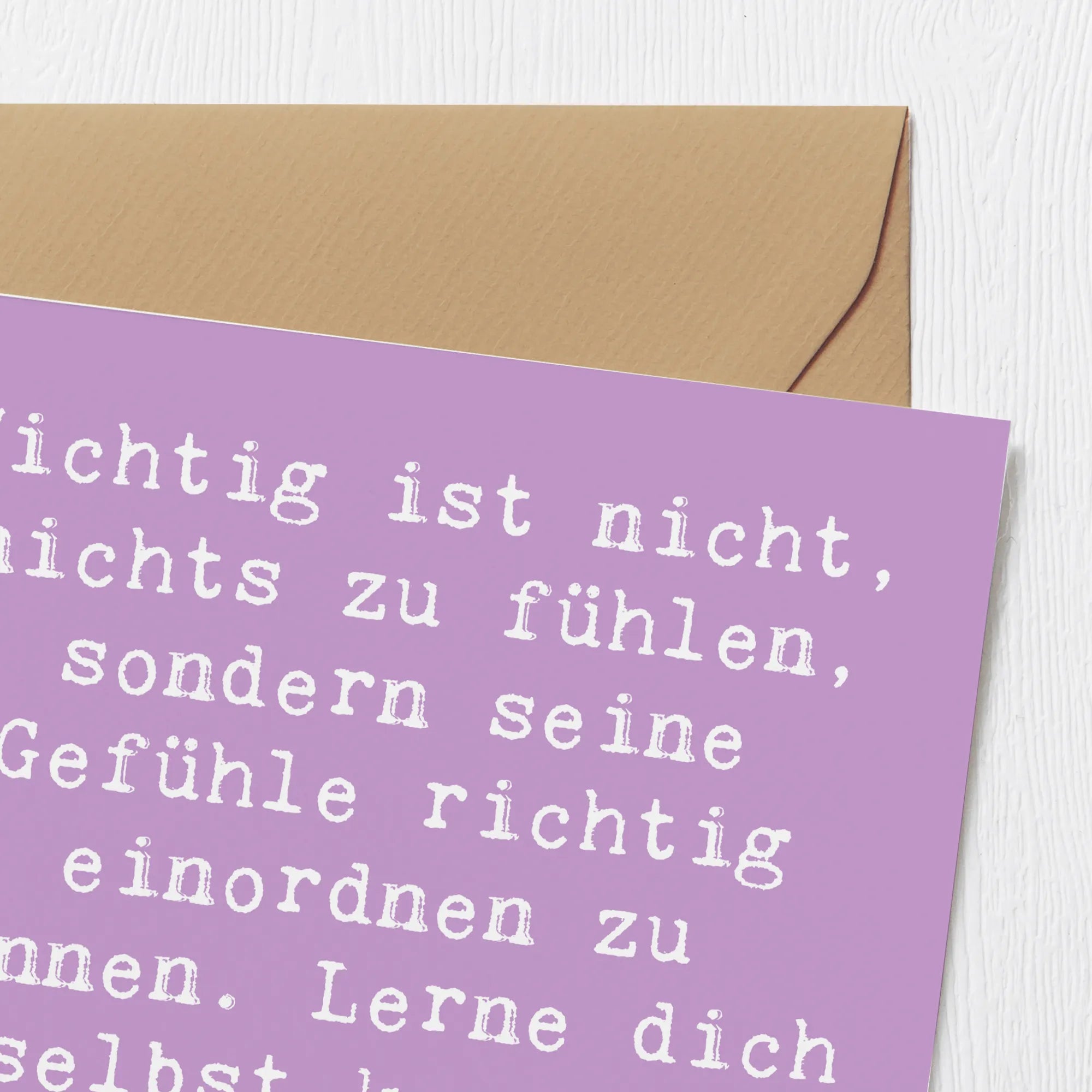 Es ist nicht nur eine einfache Karte, sondern eine Quelle der Energie und Zuversicht. Die Vorderseite ziert ein inspirierender Spruch: 'Wichtig ist nicht, nichts zu fühlen, sondern seine Gefühle richtig einordnen zu können. Lerne dich selbst kennen, dann wird alles möglich...' Dies ist eine wunderbare Botschaft, die jeden anregen kann, sich selbst zu reflektieren und die eigene Gefühlswelt zu erkunden.