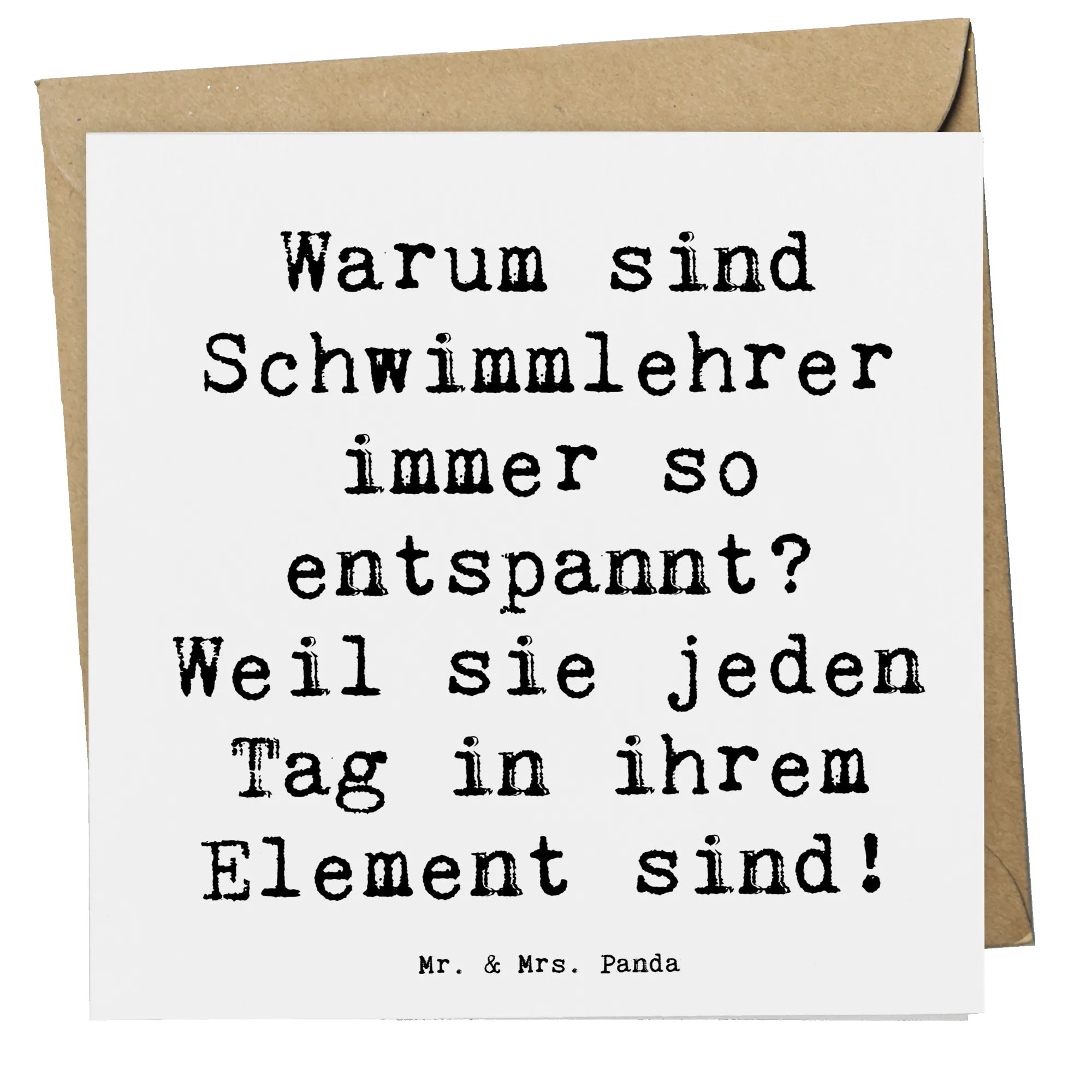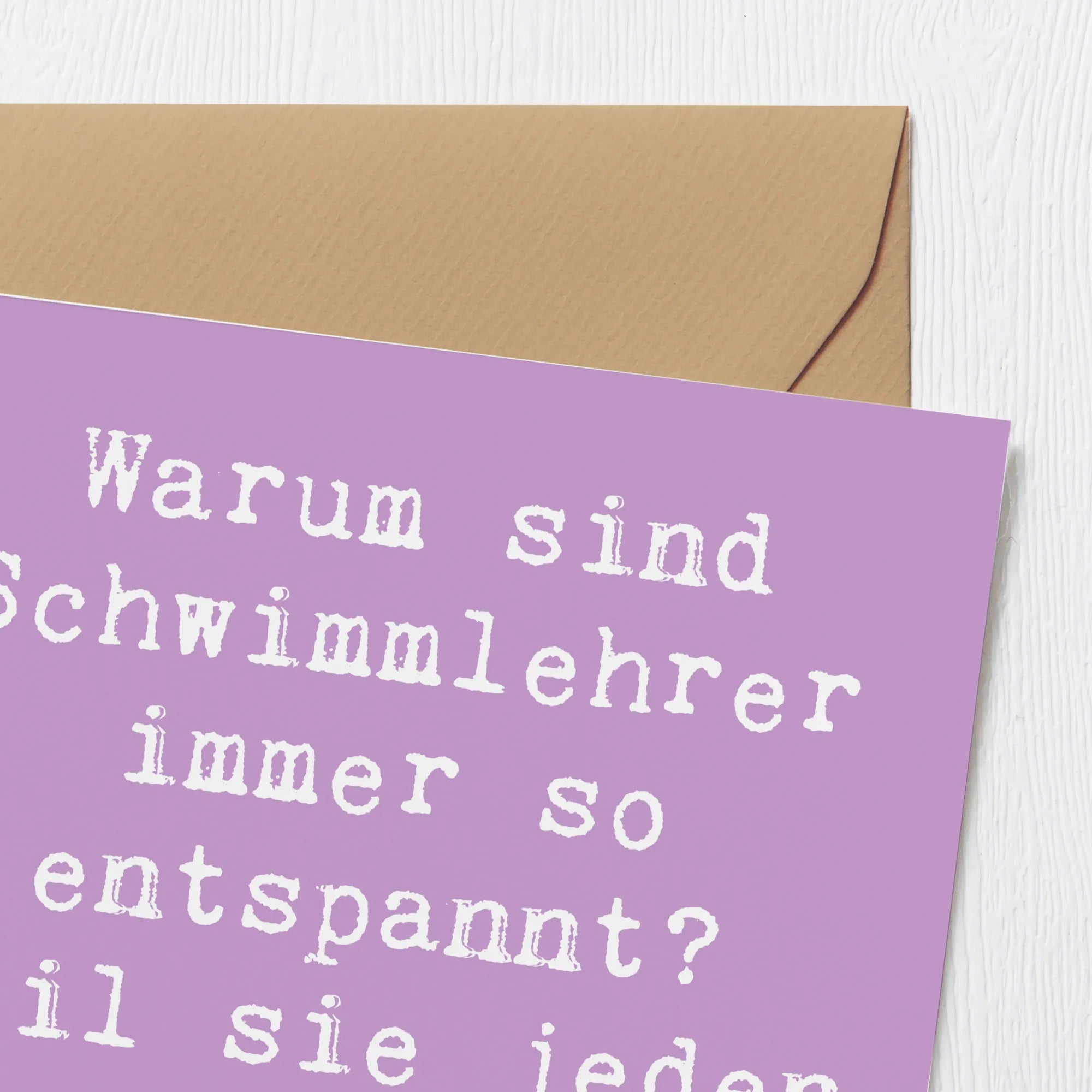 Die Vorderseite der Karte ziert ein süßes Design, das fesselnd und gleichzeitig amüsant ist. Mit dem Spruch 'Warum sind Schwimmlehrer immer so entspannt? Weil sie jeden Tag in ihrem Element sind!' zauberst du garantiert ein Lächeln auf das Gesicht des Beschenkten.