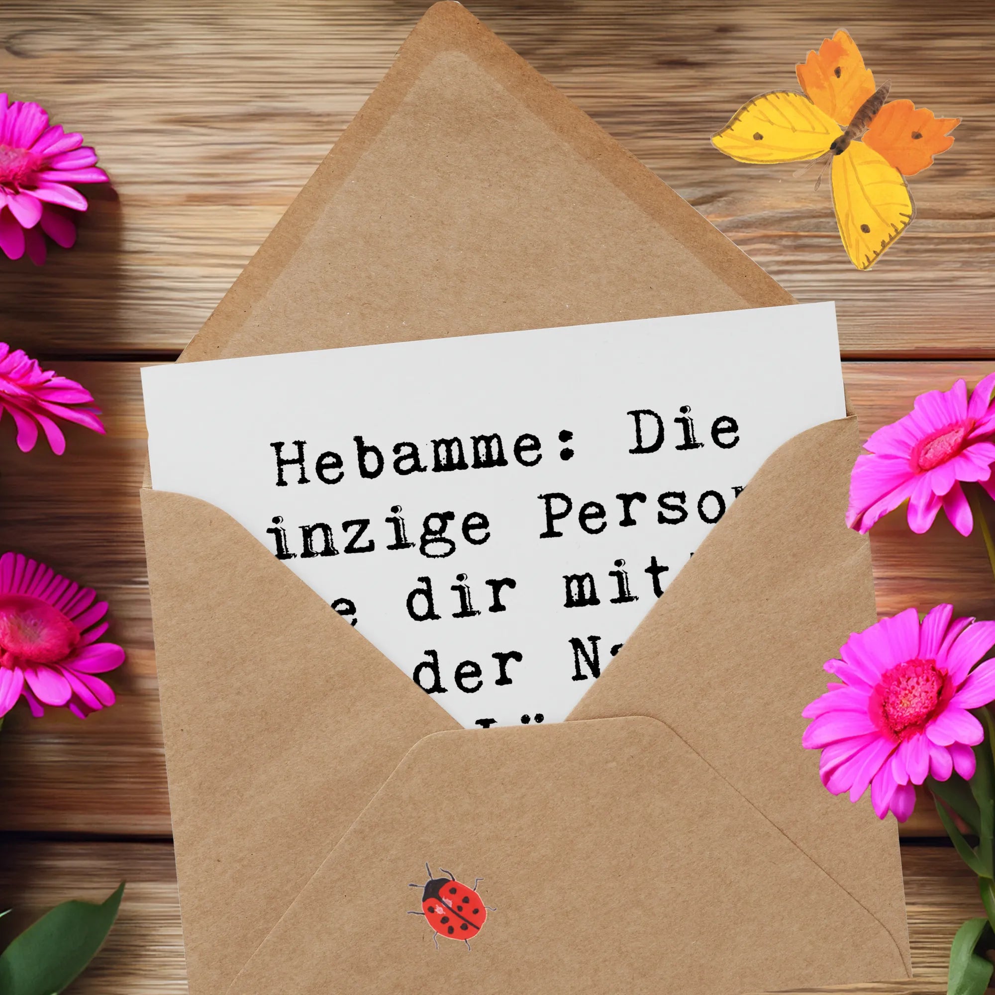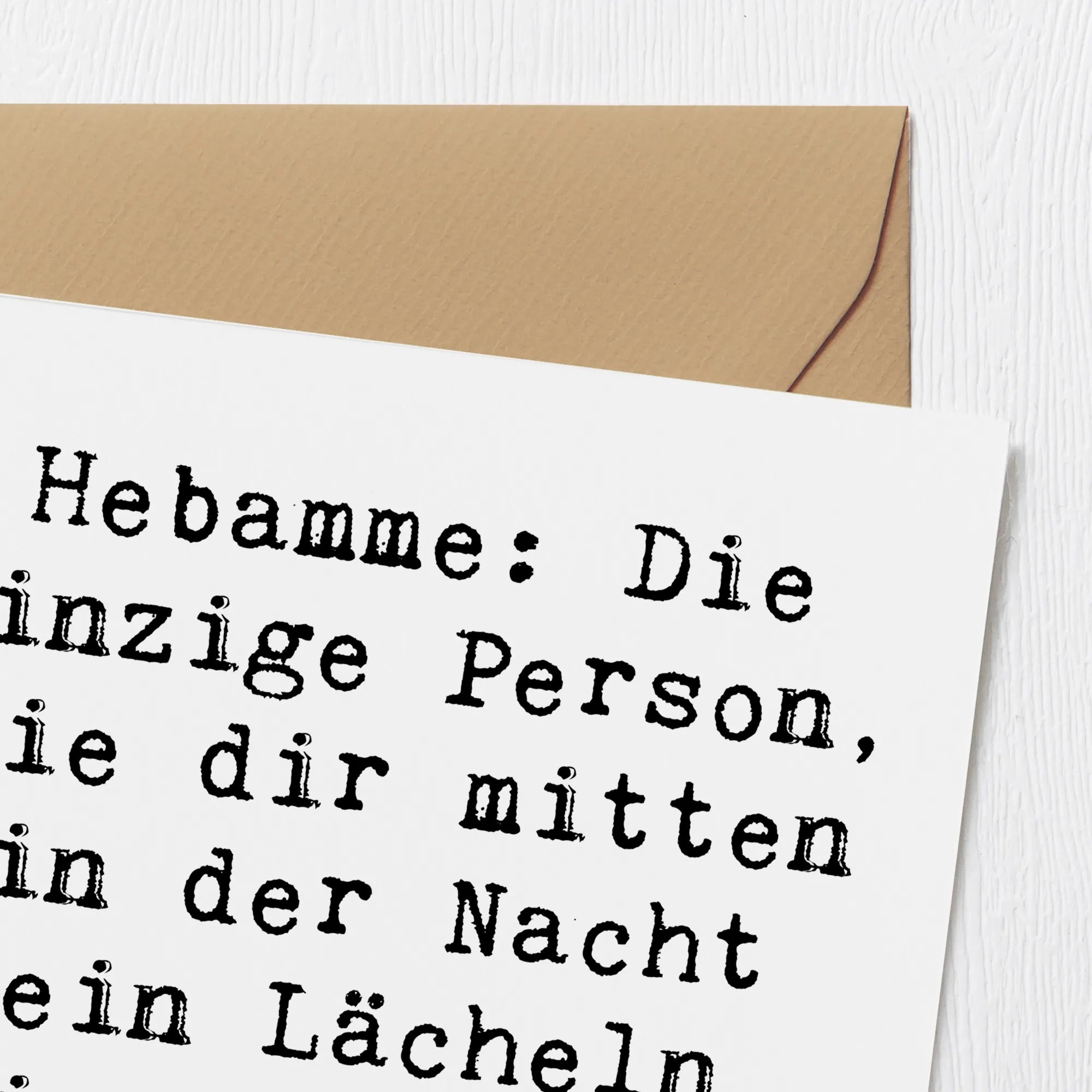 Auf der Vorderseite findest du den liebevollen Spruch: "Hebamme: Die einzige Person, die dir mitten in der Nacht ein Lächeln ins Gesicht zaubern kann!". Dieses Zitat bringt genau das zum Ausdruck, was viele frisch gebackene Eltern empfinden: Dankbarkeit, Freude und oft auch eine Prise Humor!