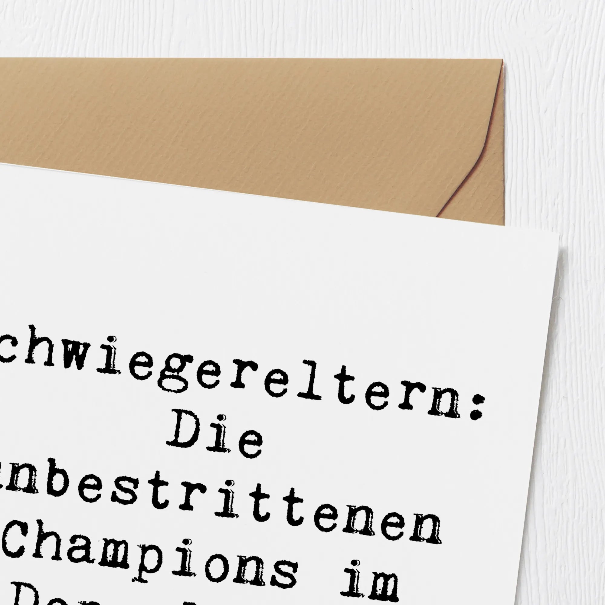 Auf der Vorderseite der Karte steht der Spruch: 'Schwiegereltern: Die unbestrittenen Champions im Doppelkopf!', der mit einem süßen Motiv untermalt wird. Dies zeigt, dass Schwiegereltern nicht nur erweiterte Verwandte sind, sondern auch wertvolle Mentoren und Unterstützer. Sie sind oft die ersten, die da sind, wenn wir Hilfe benötigen, und die, die uns auf unserem Lebensweg begleiten.