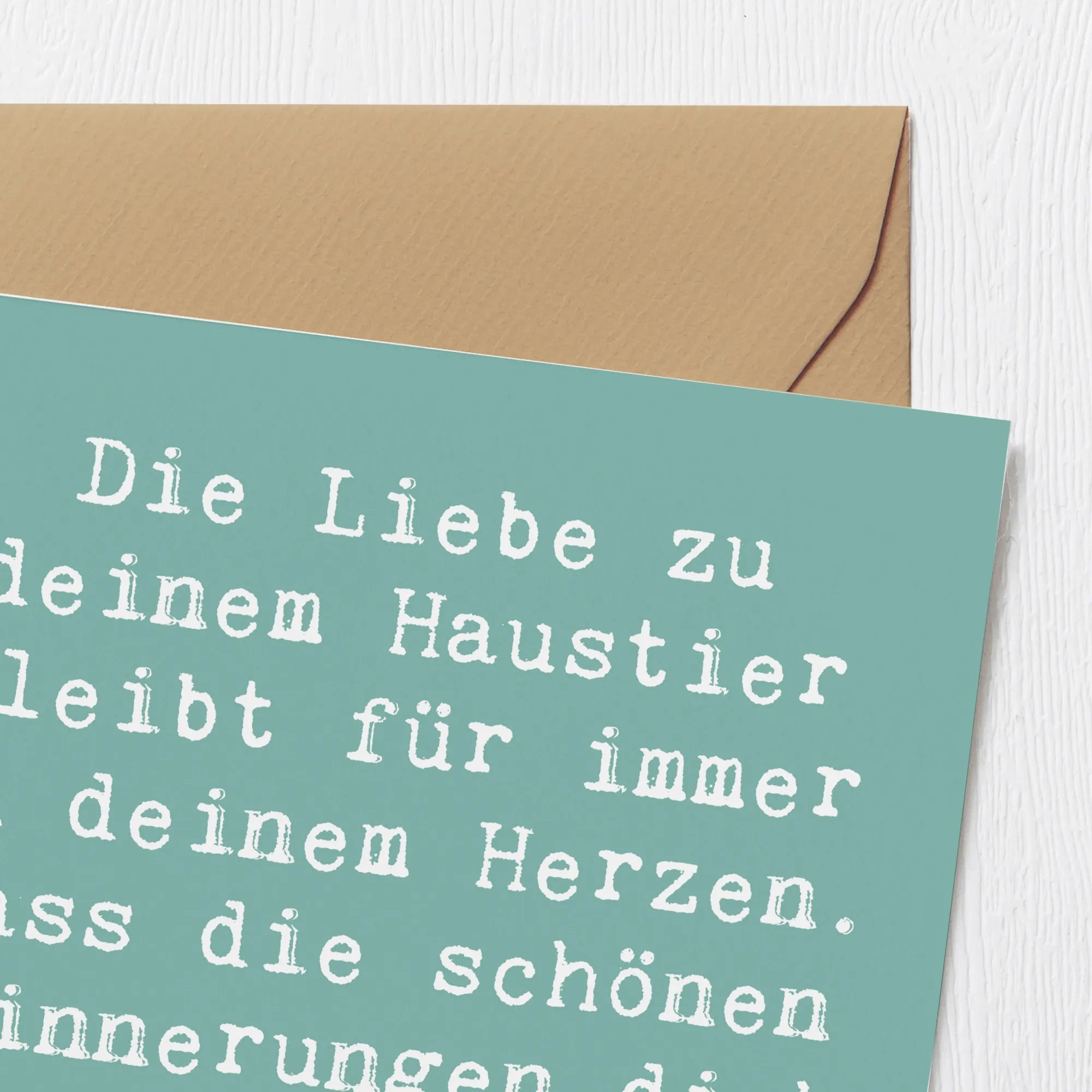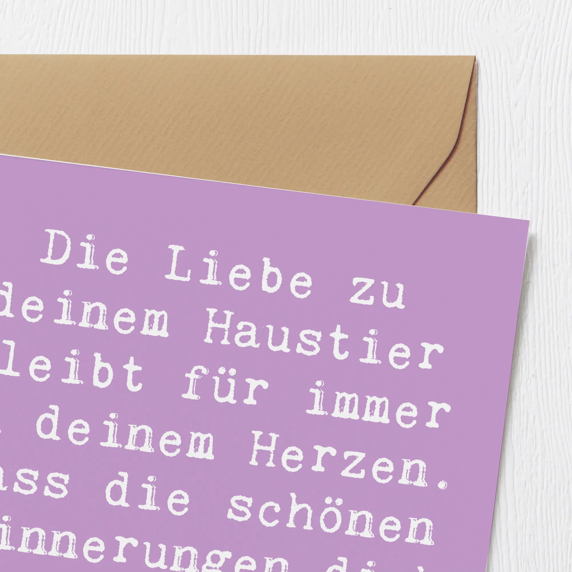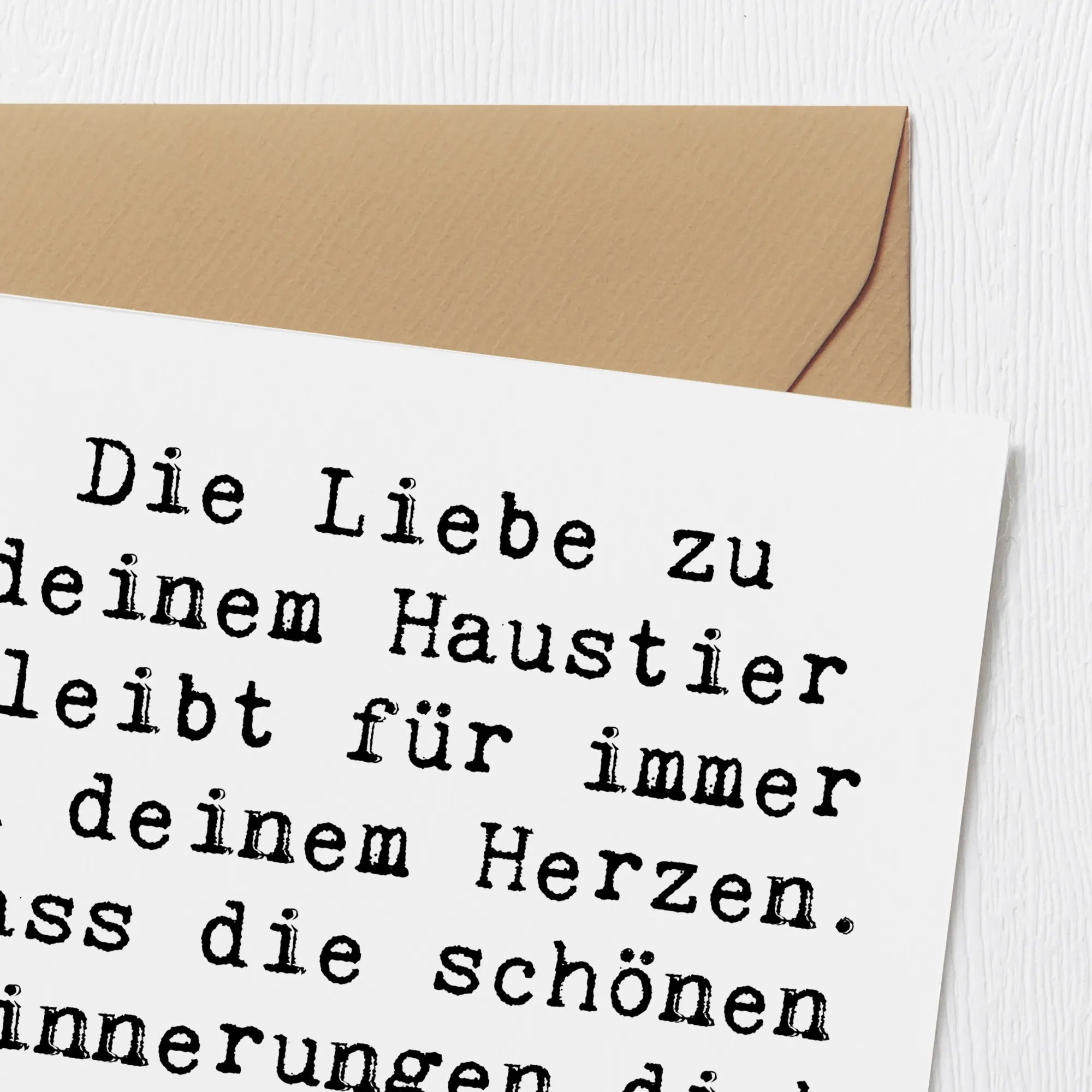 Die Vorderseite der Karte trägt den schönen Spruch: 'Die Liebe zu deinem Haustier bleibt für immer in deinem Herzen. Lass die schönen Erinnerungen dich trösten und begleiten.' Dies spricht besonders Menschen an, die einen geliebten Vierbeiner verloren haben und auf der Suche nach Worten des Trostes sind. Die Karte eignet sich hervorragend, um sie an Freunde oder Verwandte zu verschenken, die einen Verlust erlitten haben, oder um sie selbst in einem Moment der Trauer zu nutzen.