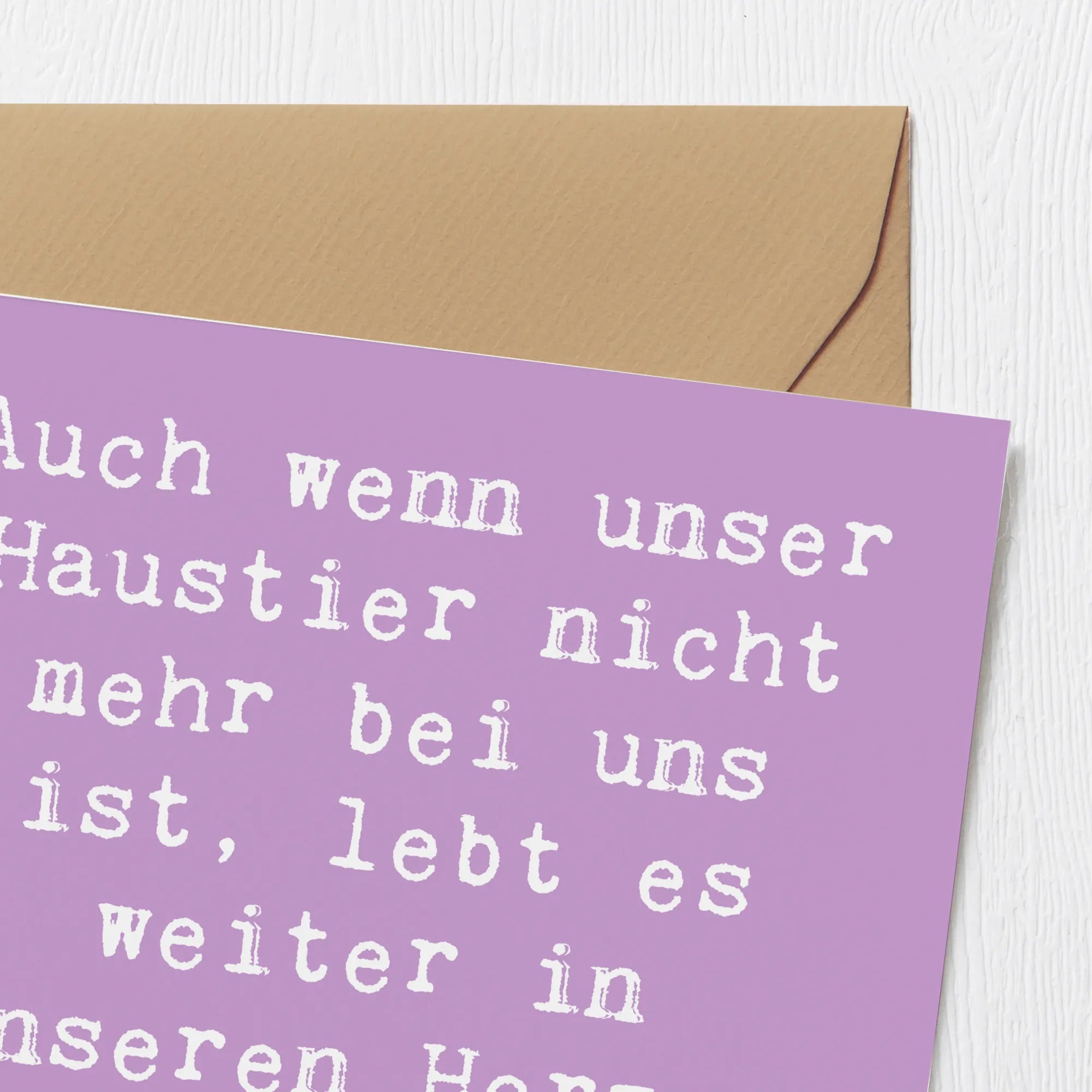 Mit dem liebevollen Spruch auf der Vorderseite: 'Auch wenn unser Haustier nicht mehr bei uns ist, lebt es weiter in unseren Herzen und Erinnerungen.' hilft sie, die Trauer ein wenig leichter zu tragen. Diese hochwertige quadratische Karte misst 140 mm x 140 mm und wird aus edlem 300 Gramm Karton hergestellt. Die matte Innenseite bietet genügend Platz für deine persönlichen Worte, und der hochglänzend veredelte Umschlag rundet das Gesamtbild perfekt ab.