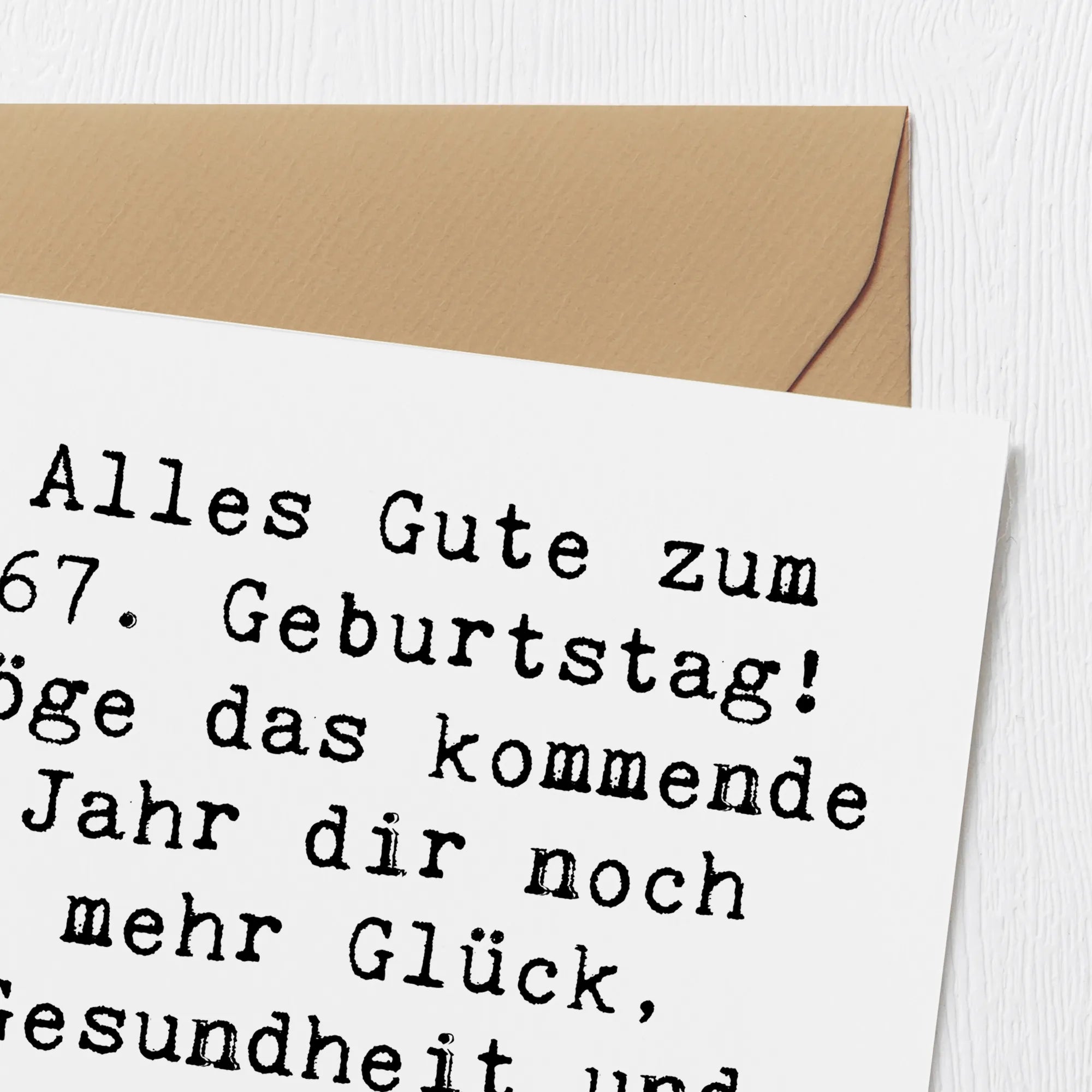 Alles Gute zu deinem 67. Geburtstag! Möge das kommende Jahr dir noch mehr Glück, Gesundheit und unvergessliche Momente bringen. Du stehst an einem wunderbaren Punkt in deinem Leben, an dem du auf viele Erfahrungen zurückblicken kannst und dennoch voller Neugier und Freude nach vorne schaust. Jeder Tag ist eine neue Gelegenheit, dein Leben in vollen Zügen zu genießen und besondere Momente zu schaffen – möge das kommende Jahr dir davon viele schenken!