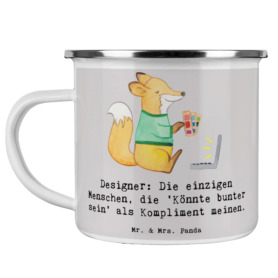 Die Camping Emaille Tasse "Designer" von Mr. & Mrs. Panda ist der perfekte Begleiter für alle kreativen Seelen und Designliebhaber! Mit ihrem einzigartigen Motiv und dem Spruch "Designer: Die einzigen Menschen, die 'Könnte bunter sein' als Kompliment meinen" verleiht sie jedem Outdoor-Abenteuer eine persönliche Note.