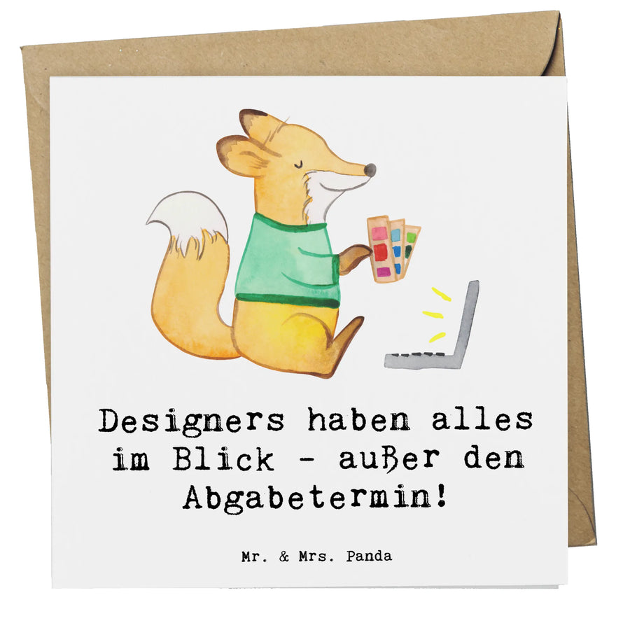 Die Karte wird aus edlem 300 Gramm Karton gefertigt und bietet dir mit einer glänzenden Vorderseite und mattierter Innenseite die ideale Vorlage, um deine persönlichen Grüße einzutragen. Mit einem Format von 140 mm x 140 mm liegt die Karte angenehm in der Hand und passt perfekt in den ebenfalls hochwertigen Umschlag, der im Lieferumfang enthalten ist. Auf der Vorderseite ziert ein liebevoll gestaltetes Motiv, das die Welt der Designer würdigt. Der geniale Spruch "Designers haben alles im Blick – außer den Abgabetermin!" bringt den kreativen Geist dieser Berufsgruppe auf den Punkt und sorgt für ein Schmunzeln bei jedem Betrachter.