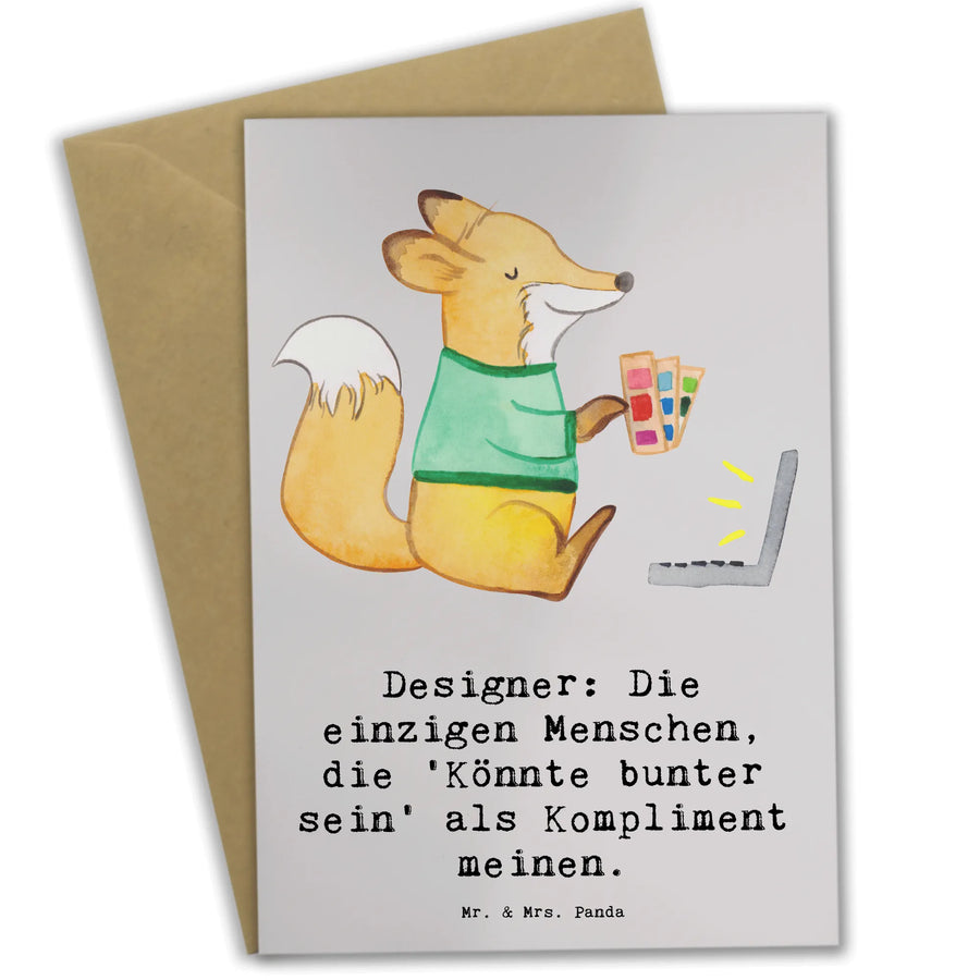 Die Grußkarte 'Designer' aus der Kollektion Berufe von Mr. & Mrs. Panda ist das perfekte Geschenk für alle kreativen Köpfe und Designer! Egal ob zum Geburtstag, zur Hochzeit oder einfach nur um einem lieben Menschen eine Freude zu machen, diese Karte bringt ein Lächeln ins Gesicht.