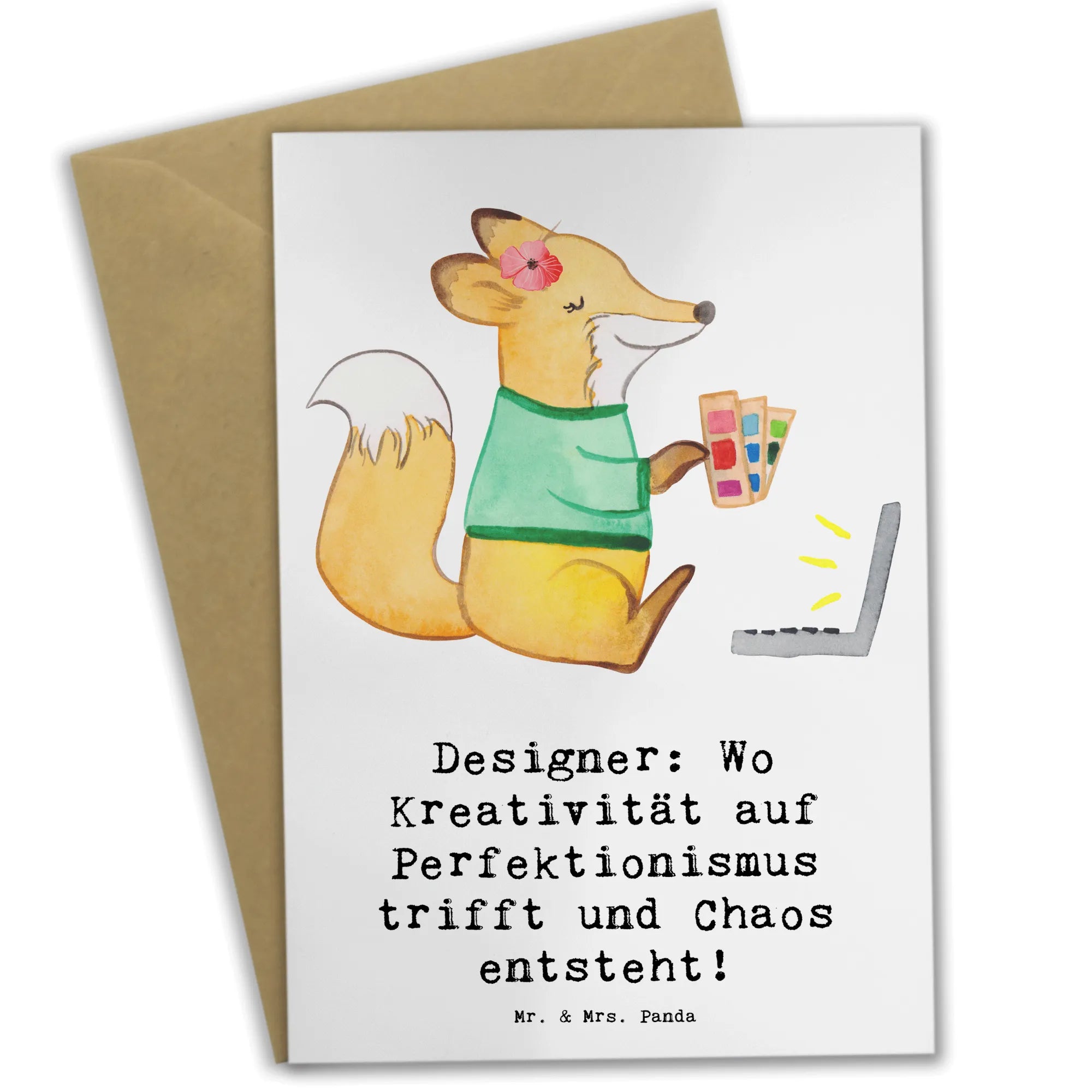 Entdecke die zauberhafte Grußkarte "Designer" aus der wunderbaren Berufe-Kollektion von Mr. & Mrs. Panda! Diese einzigartige Grußkarte ist nicht nur ein Geschenk, sondern auch eine herzliche Umarmung in Papierform. Mit einem liebevoll handgezeichneten Motiv zeigt sie die Welt der Designer - kreative Köpfe, die durch ihre Arbeit visuell ansprechende und funktionale Produkte gestalten. Von Mode über Grafikdesign bis hin zu Industriedesign, diese Karte spricht die Leidenschaft und Hingabe an, die jeder Designer in seinen Beruf steckt. Der Spruch auf der Vorderseite, "Designer: Wo Kreativität auf Perfektionismus trifft und Chaos entsteht!", bringt das kreative Chaos auf den Punkt und sorgt für Schmunzeln.