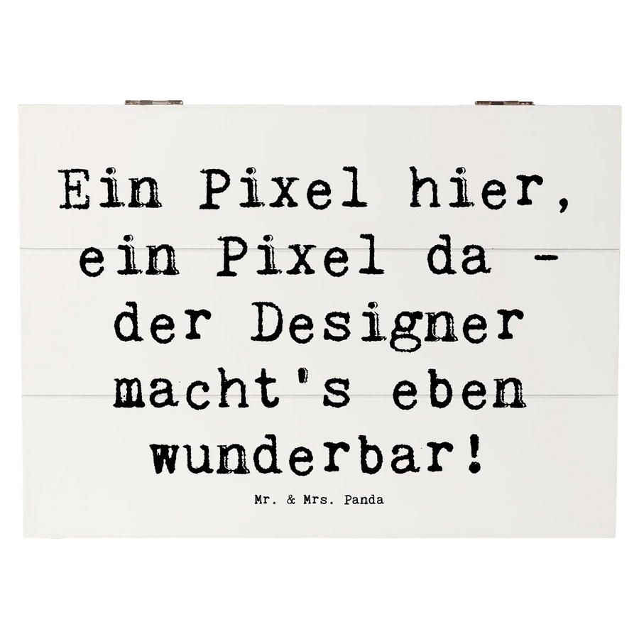 Durch das kreative Motiv eines Designers und den liebevollen Spruch: "Ein Pixel hier, ein Pixel da - der Designer macht's eben wunderbar!" spricht diese Holzkiste besonders Menschen an, die im kreativen Bereich tätig sind oder einfach eine Schwäche für Design und Ästhetik haben. Ob als Dankeschön für einen Kollegen, als Geschenk zum Berufsabschied oder einfach nur, um deinem besten Freund eine Freude zu machen – mit dieser dekorativen Aufbewahrungsbox liegst du immer richtig!