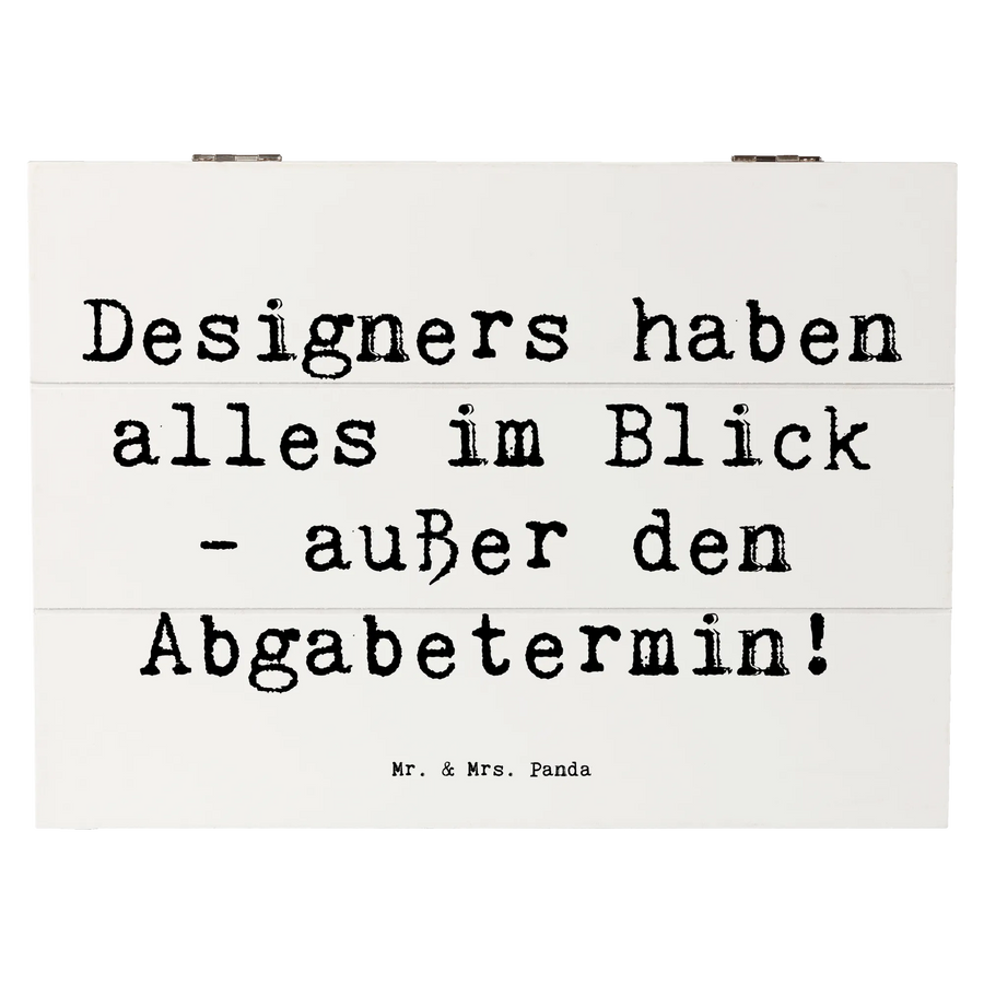Die wunderschöne Holzkiste von Mr. & Mrs. Panda ist das perfekte Geschenk für alle kreativen Köpfe unter den Designern. Mit einem liebevollen Motiv, das den Spruch "Designers haben alles im Blick - außer den Abgabetermin!" enthält, ist diese Kiste ein absoluter Hingucker und eine praktische Aufbewahrungsoption zugleich.