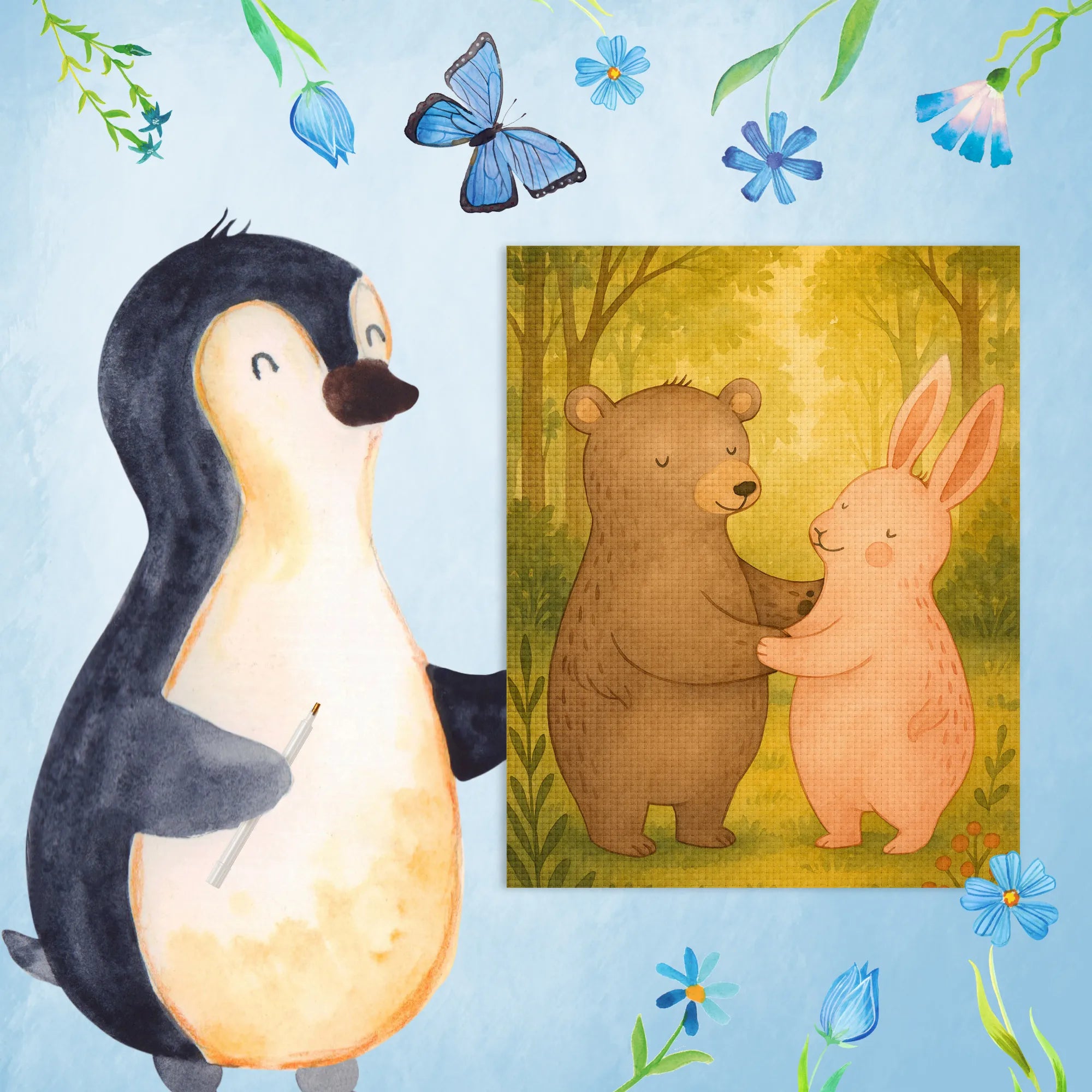 Was für ein charmantes Bild: ein Bär und ein Hase, die sich liebevoll umarmen. Der Bär, kräftig und freundlich, bückt sich leicht, um dem kleinen Hasen näher zu sein, der voller Freude zu ihm hochblickt. Diese herzerwärmende Szene fiel auf, dass wahre Freundschaft all unsere Herzen erhellt. Mit sanften, einladenden Farben in Braun und Rosarot wird eine Atmosphäre von Freude und Verbundenheit geschaffen. Es ist, als würde man den Herzschlag ihrer Nähe spüren, der uns einladen möchte, ebenfalls vielleicht mal einen engen Freund festzuhalten. Diese Darstellung ist eine schöne Erinnerung daran, wie wertvoll Menschen in unserem Leben sind, die uns lieben und unterstützen. Künstlerisch umgesetzt, spiegelt sie die Einfachheit und die Wunder der Freundschaft wider. Lass dich von diesen beiden liebenswerten Charakteren inspirieren, um selbst kleine, liebevolle Gesten in deinem Alltag zu teilen.
