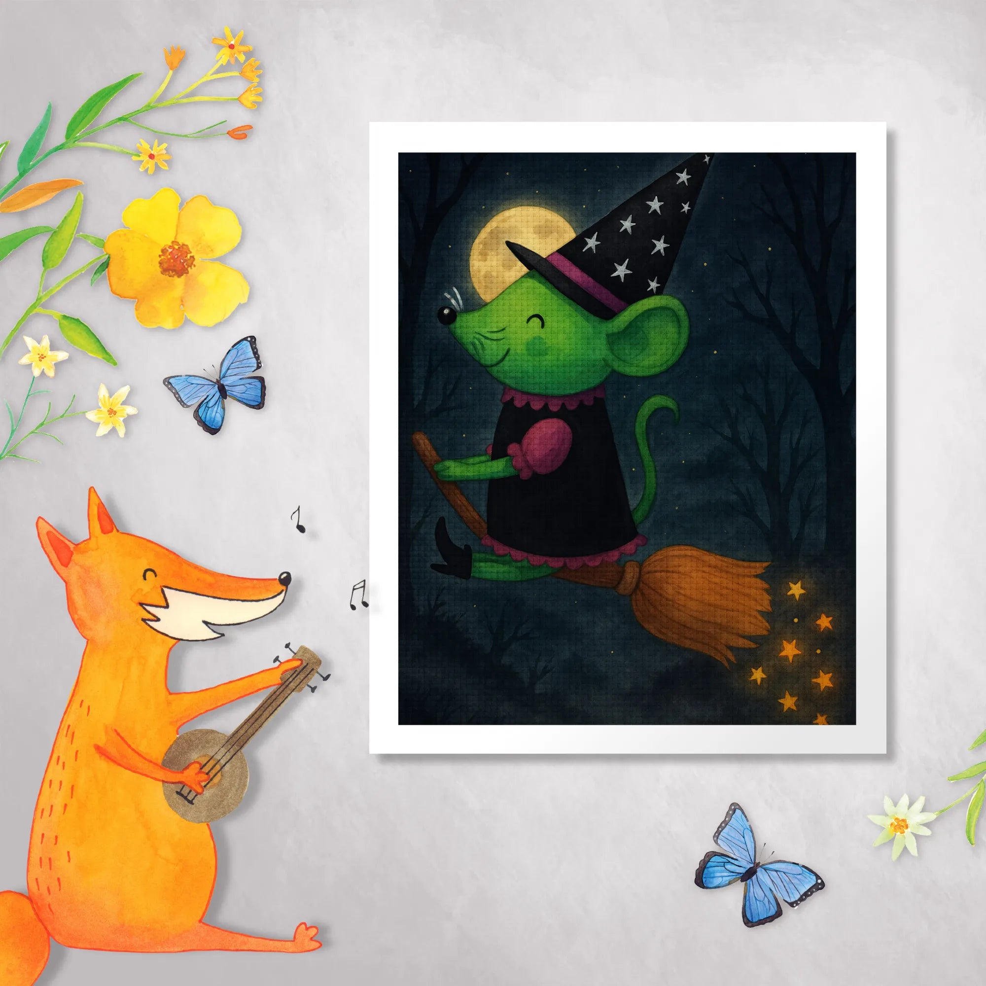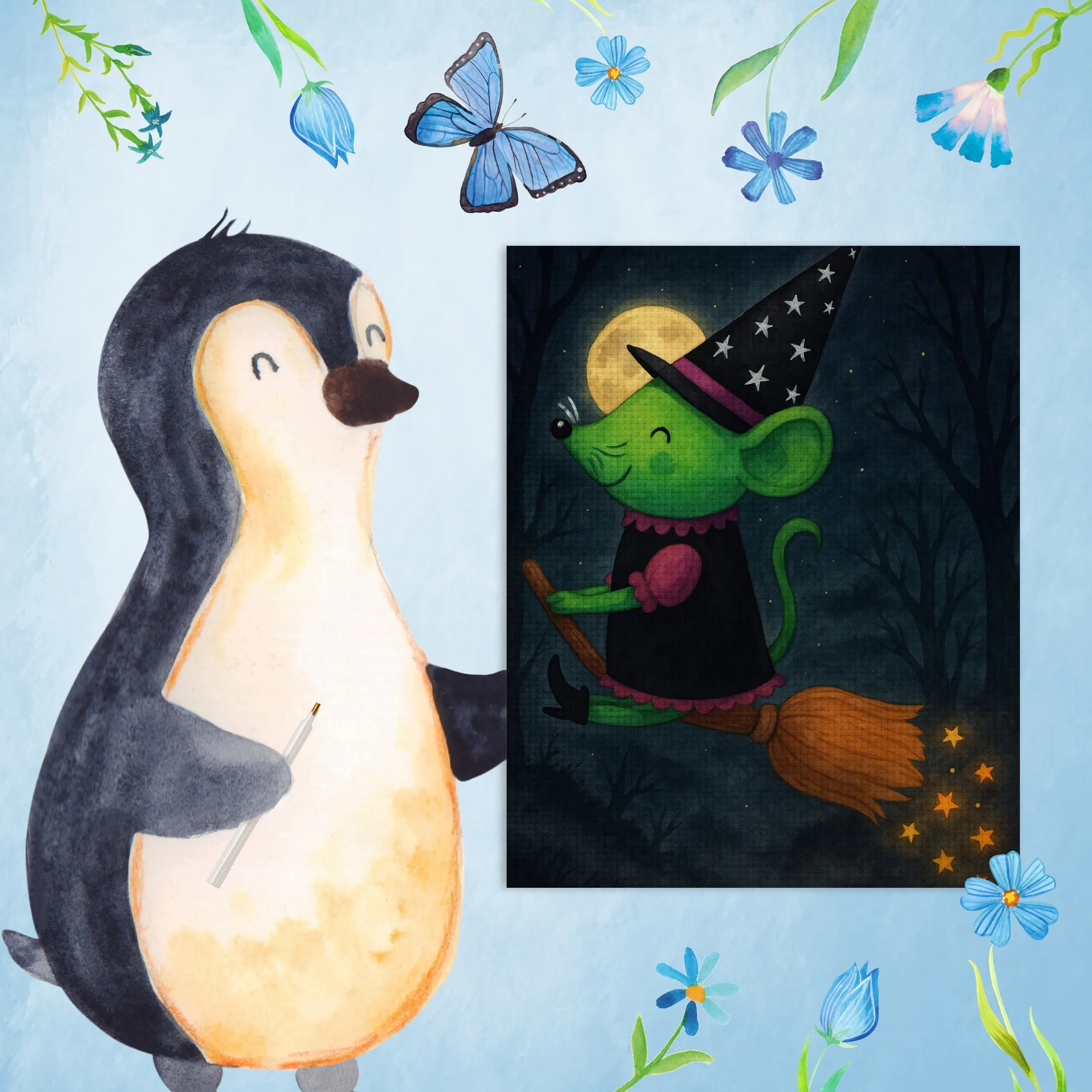Es ist Zeit für ein bisschen Magie mit unserer kleinen Hexe, die fröhlich auf ihrem Besen durch die Luft fliegt! Diese grüne Maus hat ihren schwarzen Hexenhut geschwungen und trägt ihr bestes schwarzes Kleid, während sie die Sterne an ihrem Hut mit einem Lächeln betrachtet. Sie verkörpert den Zauber von Abenteuer und Fantasie. In jedem Winde, den sie spürt, pulsiert die Freude am Fliegen und die Freiheit des Herumzeigens. Ob sie nun nach magischen Zutaten sucht oder einfach nur den Himmel erkundet, unsere Hexe beeindruckt mit ihrem fröhlichen Charme und einer gehörigen Portion Mut! Lassen Sie sich von ihrer Neugier und ihrem Herzwärme mitreißen! Denn in der Welt der Hexen und Mäuse ist alles möglich, solange man an seine Träume glaubt und mit einem Lächeln in die Lüfte steigt. Diese hübsche Darstellung wird sicherlich jedem ein Lächeln ins Gesicht zaubern und daran erinnern, dass die schönste Magie immer im Herzen beginnt.