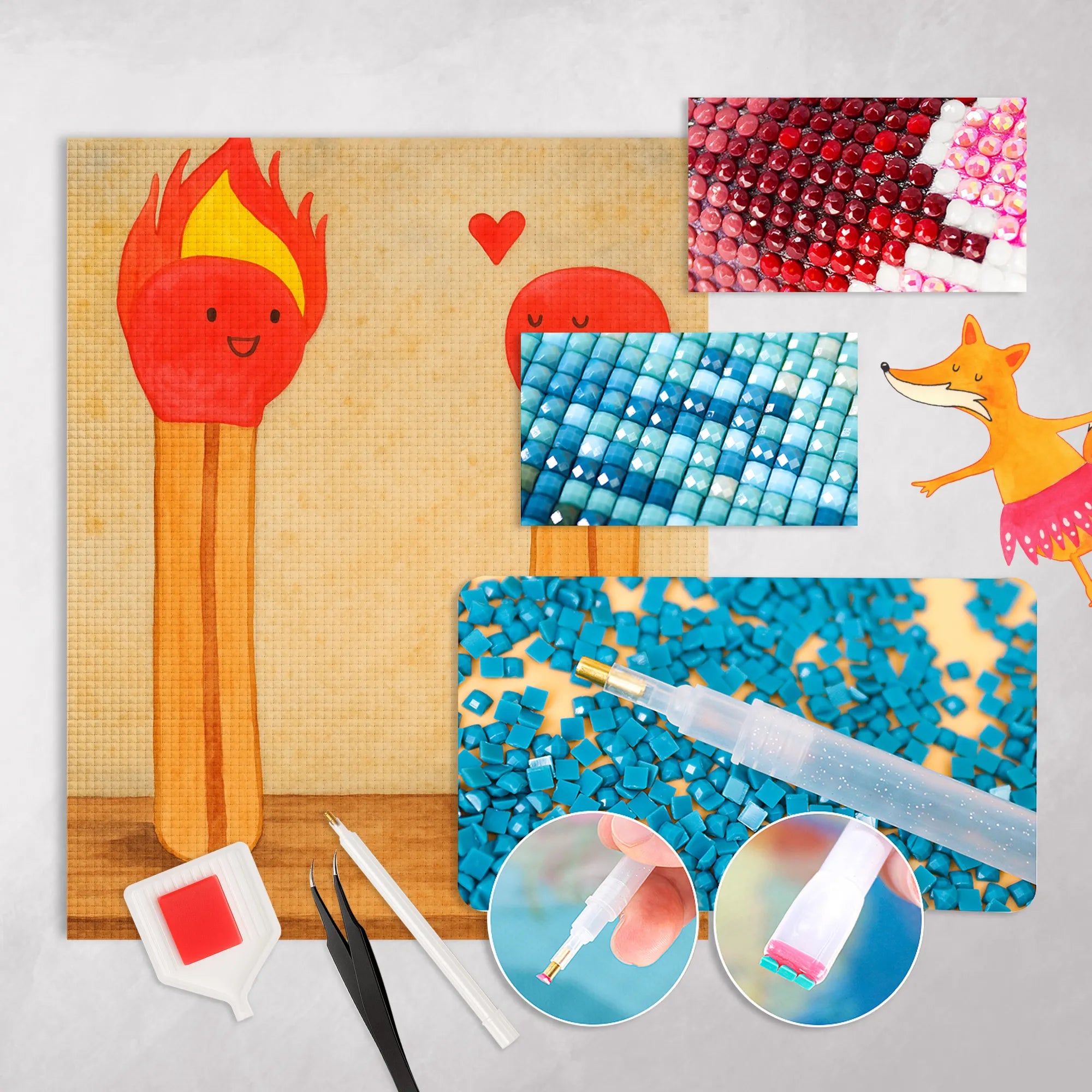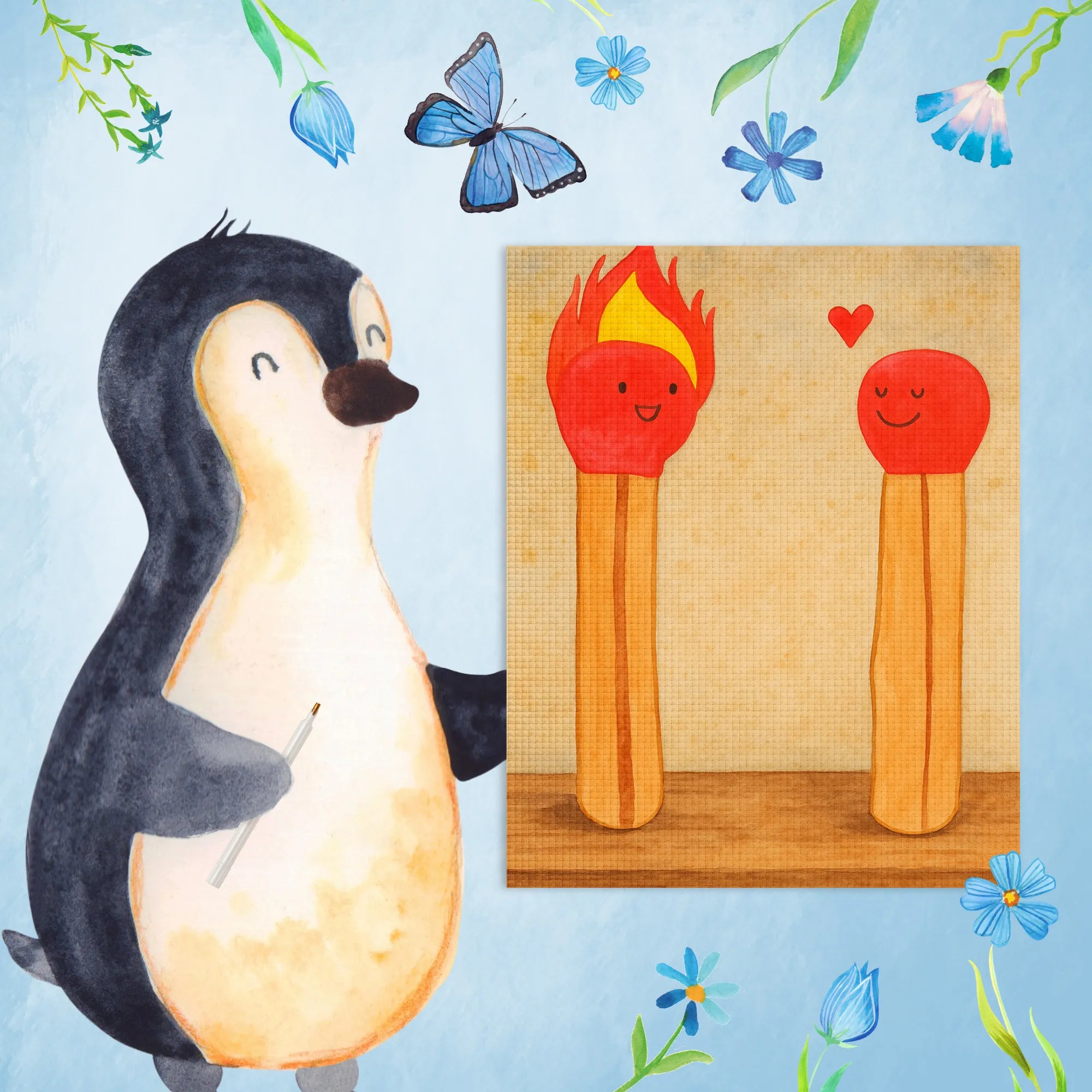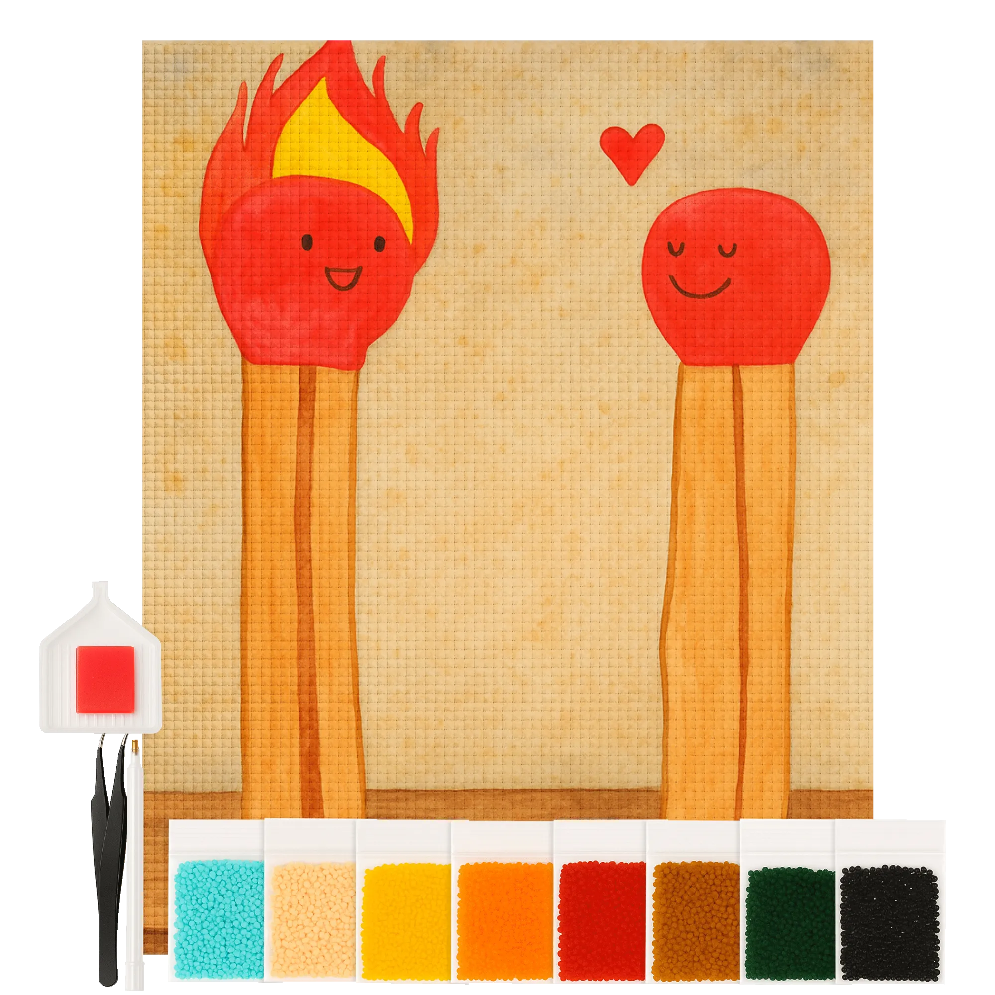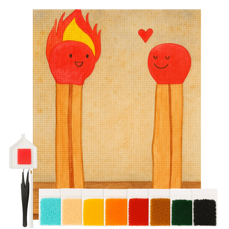 Was für ein herzlicher Anblick! Zwei putzige Streichhölzer scheinen direkt aus einer Märchenwelt zu kommen. Das linke Streichholz ist in Flammen gehüllt – sein roter Kopf und die gelben Flammen bringen Kraft und Freude in unsere Herzen. Das rechte Streichholz, noch nicht brennend, strahlt ebenso ansteckende Fröhlichkeit aus. Ihre kleine Verbindung in Form eines Herzen zwischen ihnen zeigt, wie wichtig es ist, Freunde um sich zu haben, die uns anfeuern. Diese beiden erinnern uns daran, dass es die spontanen, lockeren Momente im Leben sind, die uns das echte Glück bringen. Ein Augenzwinkern genügt, und sie lassen uns an die Macht der Freundschaft glauben!