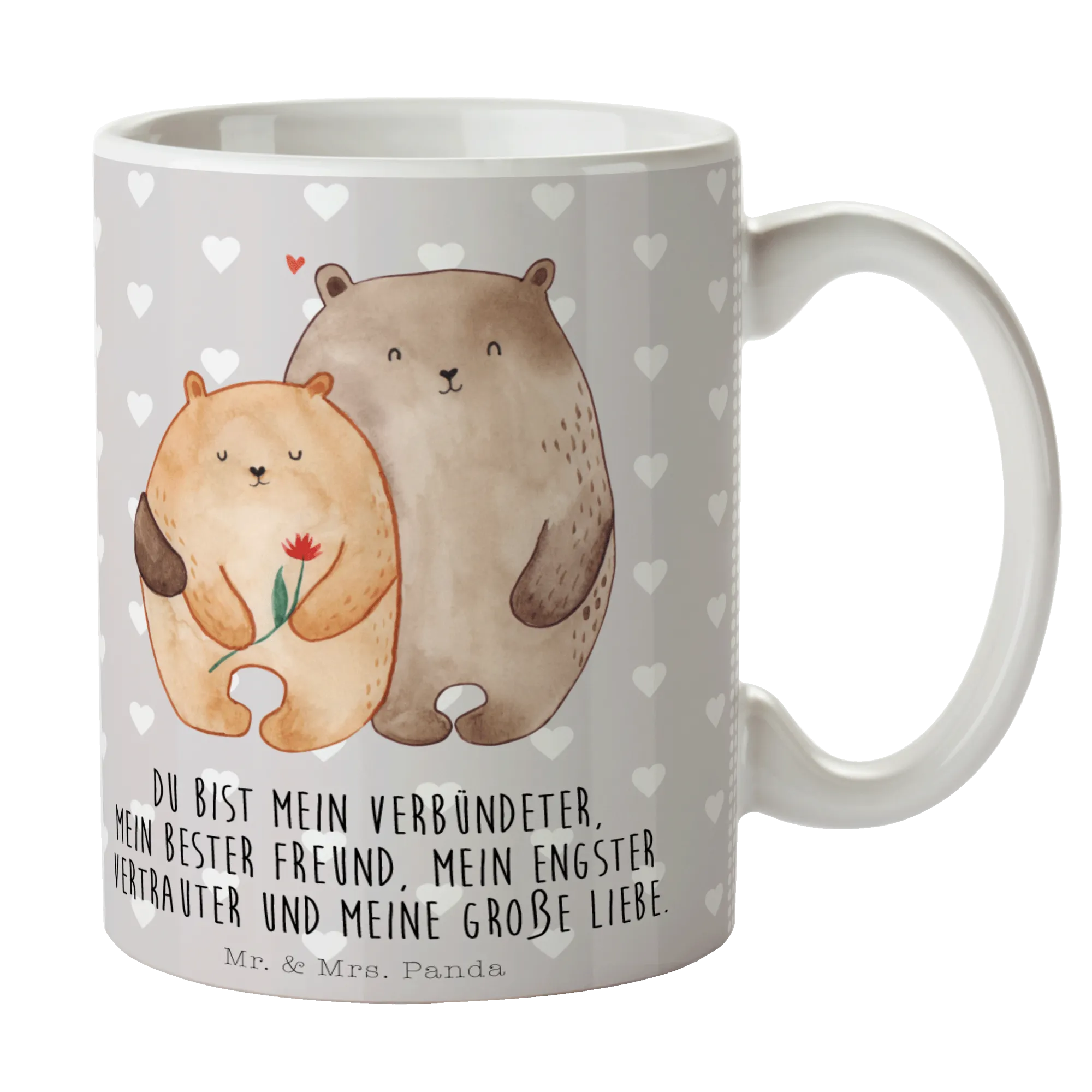 Unsere Tasse zeigt zwei niedliche Bären, die zusammen ein Herz formen. Der linke Bär hält liebevoll eine Blume, zwischen ihnen schwebt ein kleines Herz. Das Motiv in sanften Brauntönen strahlt Wärme und Zärtlichkeit aus. Dazu der schöne Spruch: „Du bist mein Verbündeter, Mein bester Freund, mein engster Vertrauter und meine große Liebe.“ — ein Satz, der direkt ins Herz trifft.