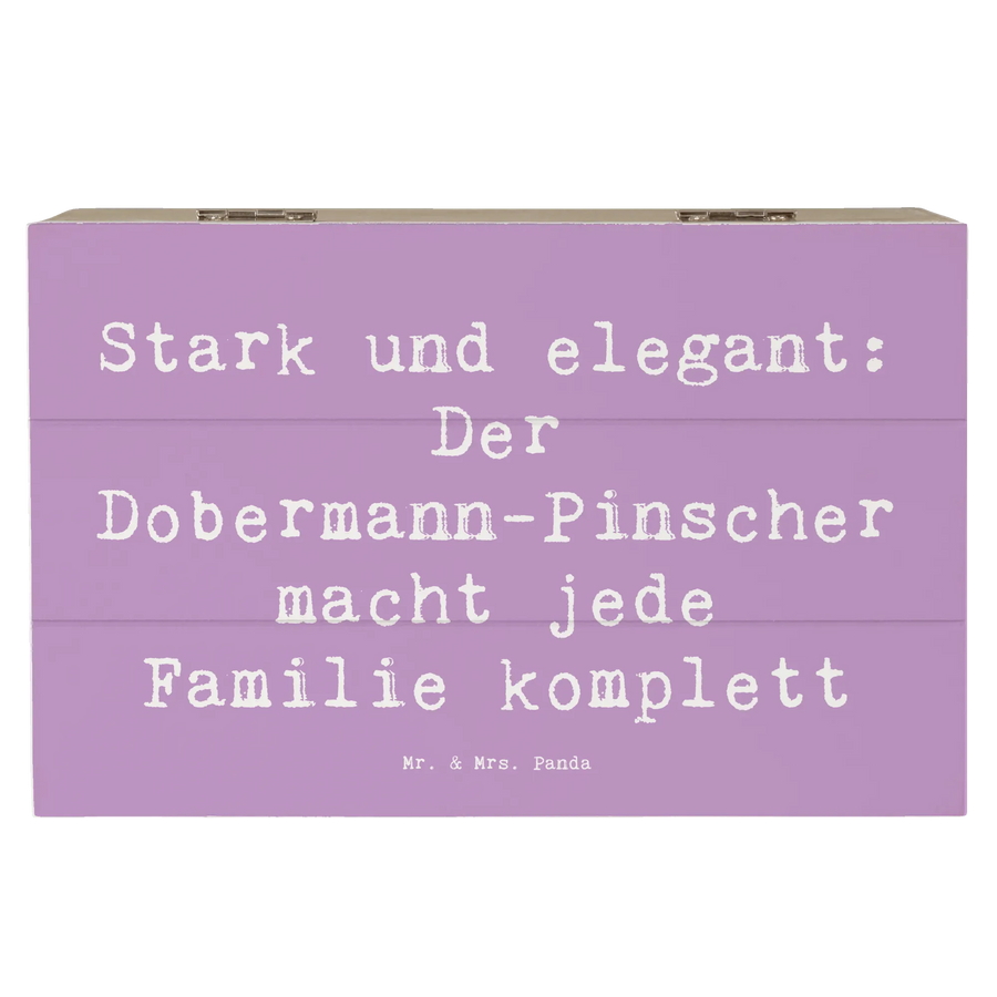 Diese besondere Holzkiste ist mit einem bezaubernden Motiv des Dobermann-Pinschers versehen und trägt den charmanten Spruch: Stark und elegant: Der Dobermann-Pinscher macht jede Familie komplett.