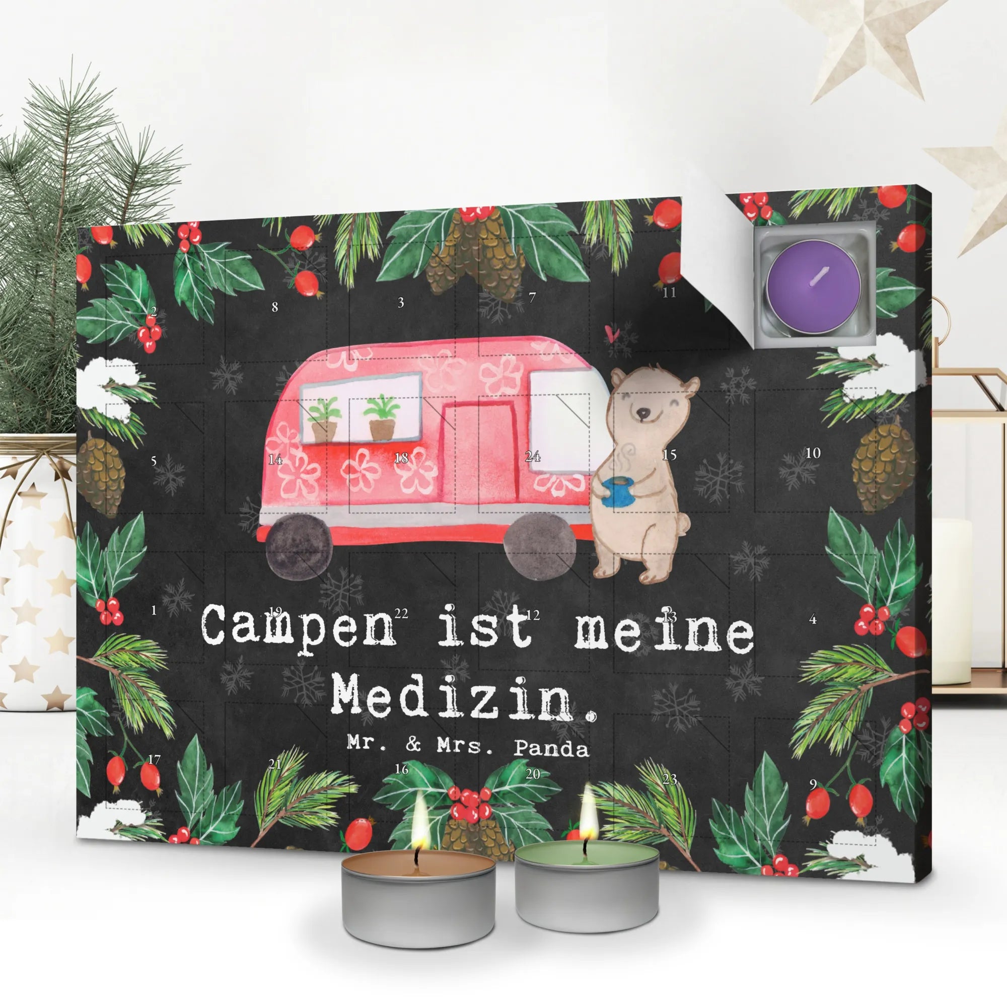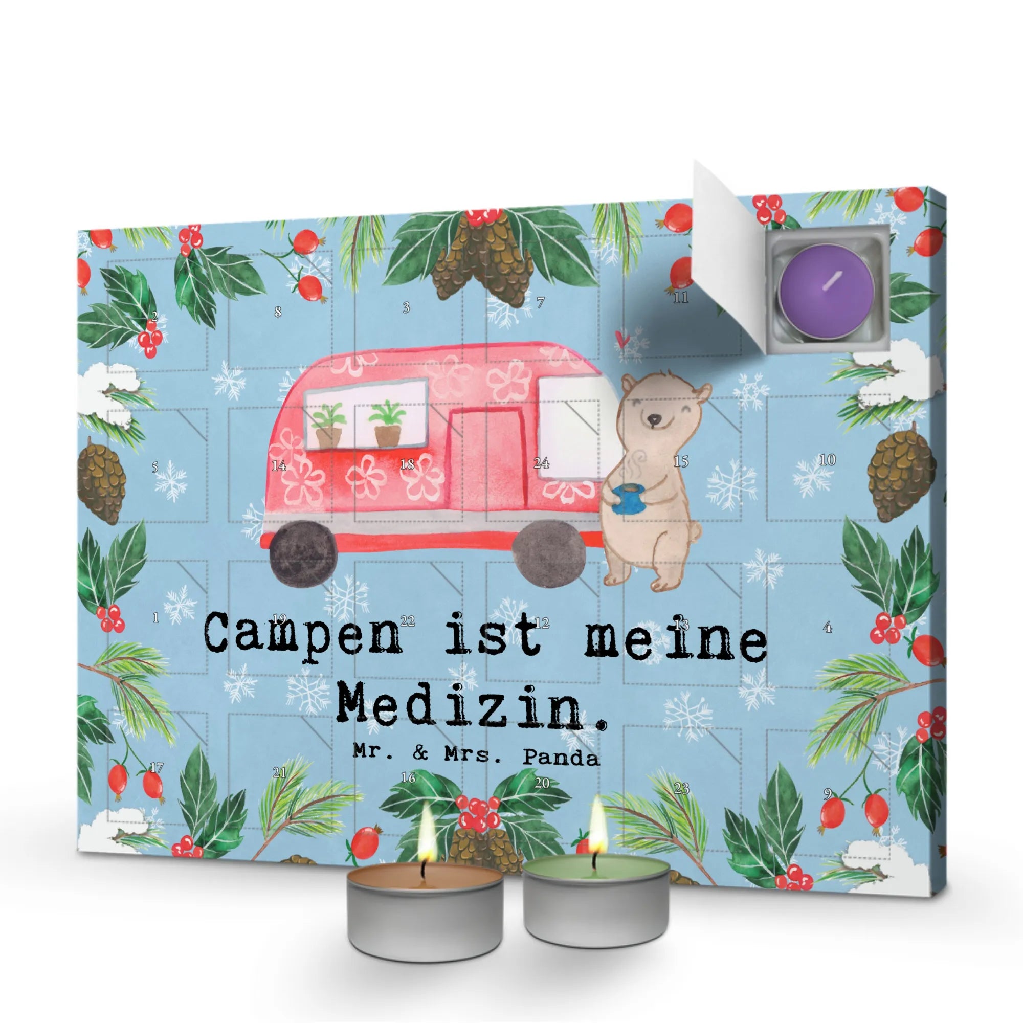 Der Duftkerzen Adventskalender Bär Camper Medizin von Mr. & Mrs. Panda ist das perfekte Geschenk für alle Campingliebhaber und Duftkerzen-Fans! Wenn du es liebst, die Natur zu entdecken, deine Zeit im Wohnmobil zu verbringen oder einfach nur gern Zeit im Freien zu verbringen, dann ist dieser Kalender genau das Richtige für dich.
