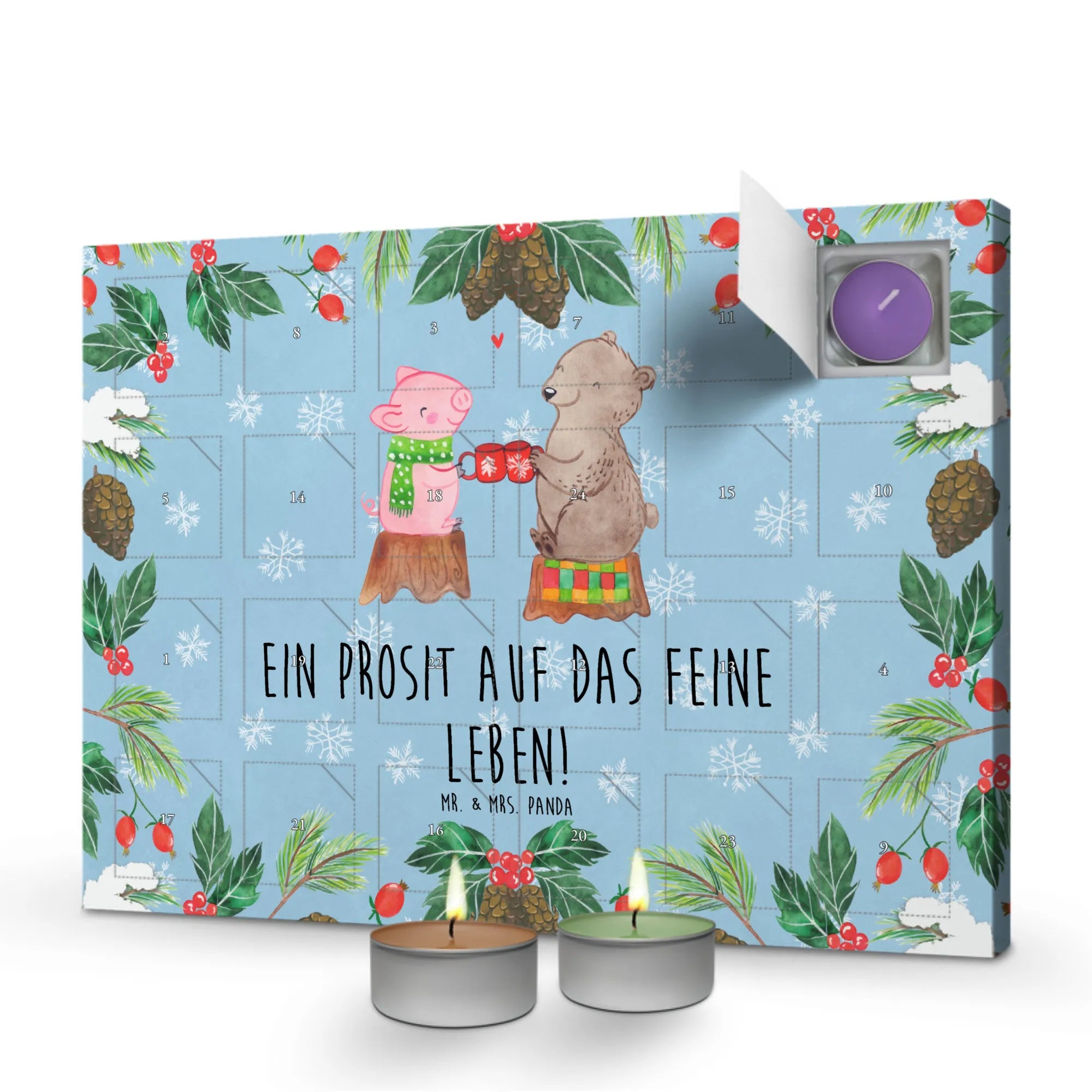 Das liebevoll gestaltete Motiv von Mrs. Panda zeigt ein niedliches Schweinchen und einen Bären, die mit einer Tasse anstoßen und sich auf eine besinnliche Zeit freuen. Jedes Detail ist handgezeichnet und verleiht dem Kalender einen einzigartigen Charme. Der Spruch "Ein Prosit auf das feine Leben!" bringt zusätzlich Freude und Heiterkeit in die kalte Jahreszeit.