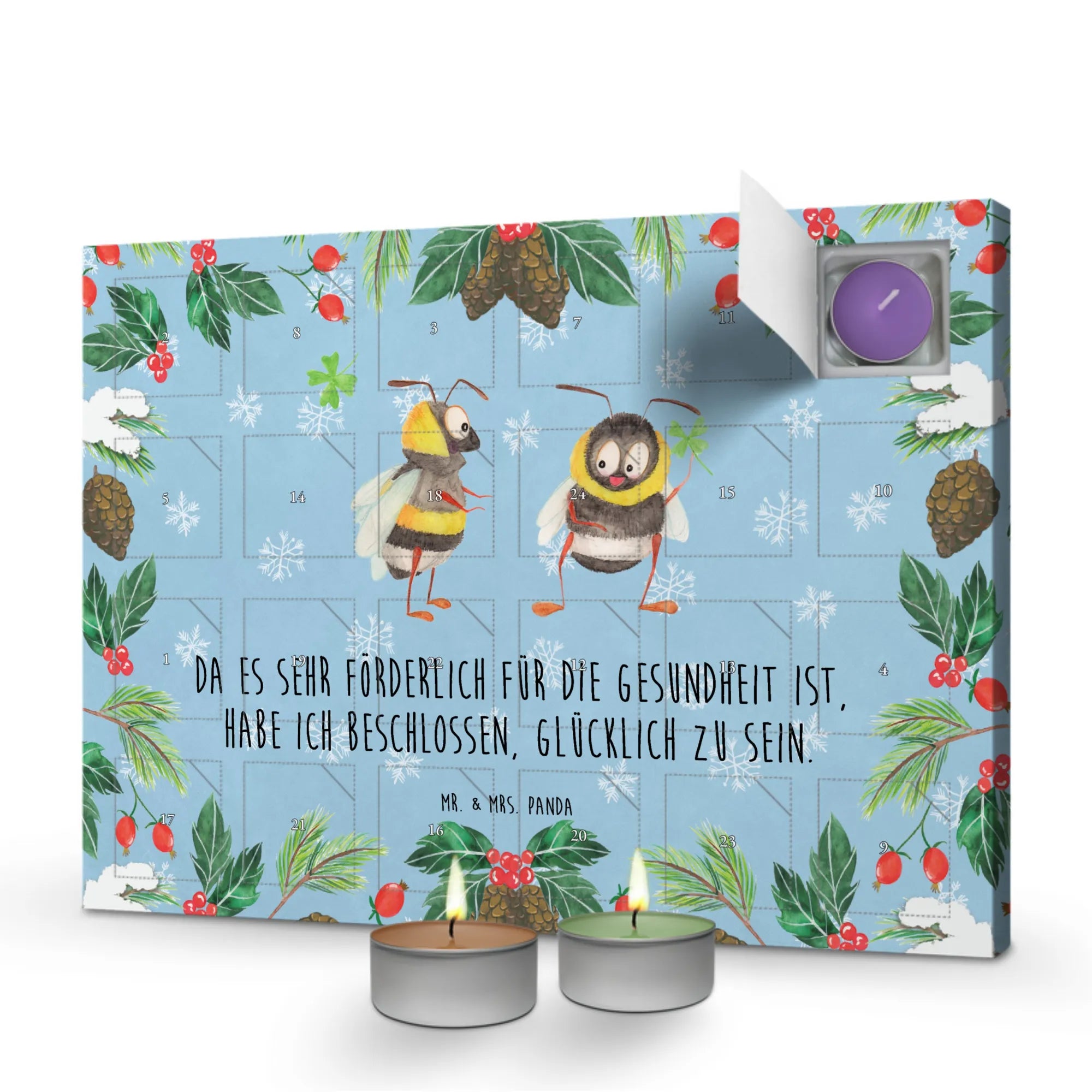 Mr. & Mrs. Panda Duftkerzen Adventskalender „Hummeln mit Kleeblatt“ – ein zauberhaftes Geschenk aus der Small World Kollektion, das Herz und Sinne verwöhnt. Das niedliche Motiv zeigt zwei Hummeln, die gemeinsam ein Kleeblatt halten, und trägt den positiven Spruch: „Da es sehr förderlich für die Gesundheit ist, habe ich beschlossen, glücklich zu sein.“ Dieses kleine Statement macht jeden Adventstag ein Stück heller und fröhlicher. ✨