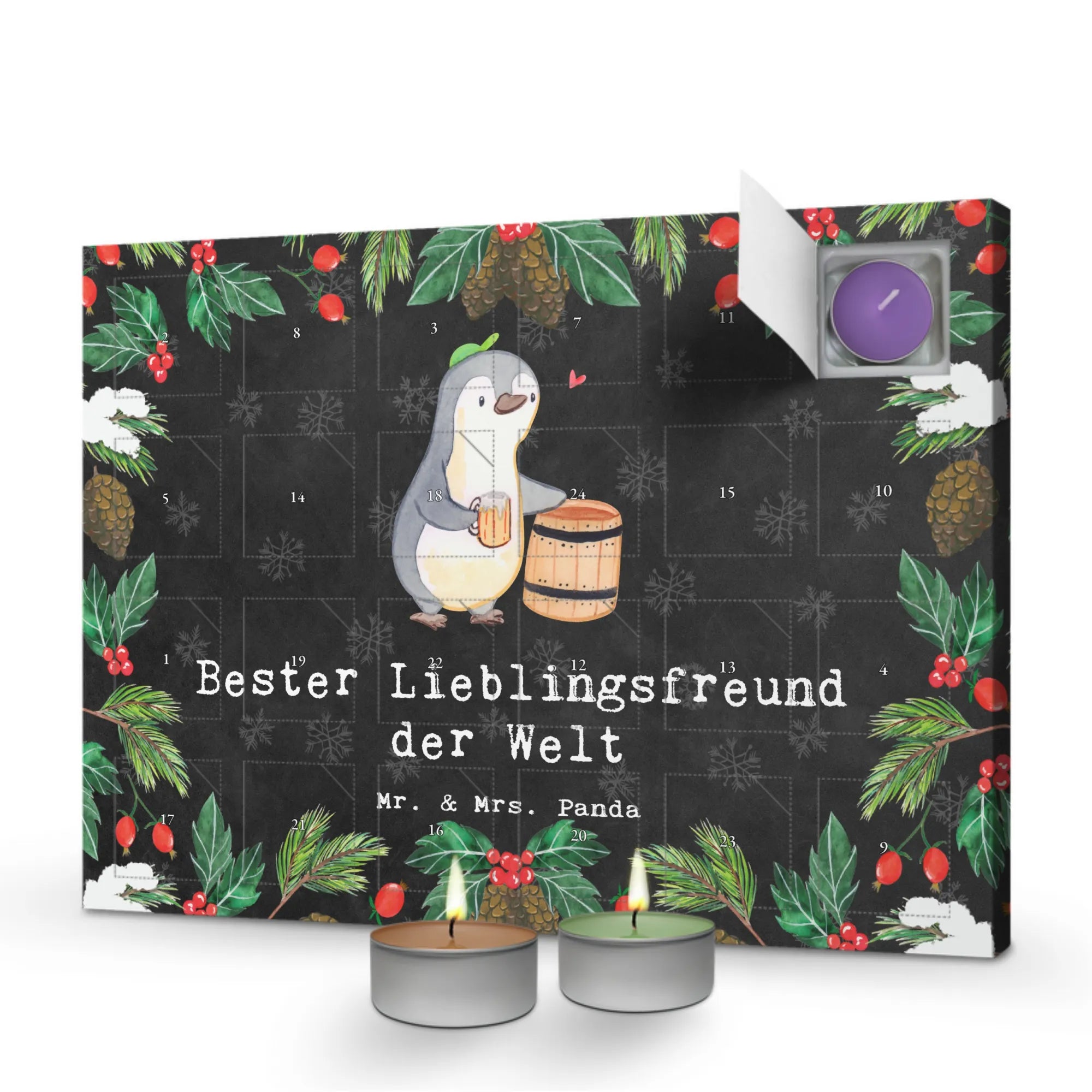 Der Duftkerzen Adventskalender mit dem süßen Motiv "Pinguin Bester Lieblingsfreund der Welt" von Mr. & Mrs. Panda ist das perfekte Geschenk für all jene, die die Vorweihnachtszeit besonders gestalten möchten. Liebevoll gestaltet, bietet dieser Kalender nicht nur wundervolle Duftkerzen, sondern auch eine tägliche Portion Freude und Überraschung!