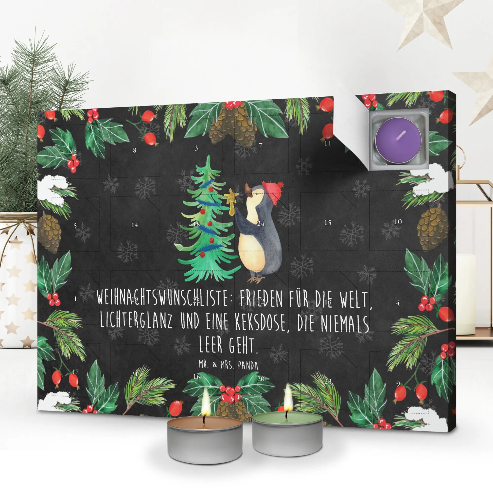 Die Winter Kollektion von Mr. & Mrs. Panda bietet dir jede Menge Inspiration mit ihren zauberhaften Motiven. Der Duftkerzen Adventskalender Pinguin Weihnachtsbaum ist einer dieser Schätze, der mit einem nostalgischen und fröhlichen Gefühl gefüllt ist. Und vergiss nicht den inkludierten Spruch: „Weihnachtswunschliste: Frieden für die Welt, Lichterglanz und eine Keksdose, die niemals leer geht.“ Dieser Kalender ist mehr als ein Produkt – er ist eine kleine Auszeit vom hektischen Alltag und ein Produkt, das die Herzen erwärmt. Mach es dir gemütlich, genieße die Düfte und freue dich auf die besinnlichste Zeit des Jahres mit unserem Duftkerzen Adventskalender!