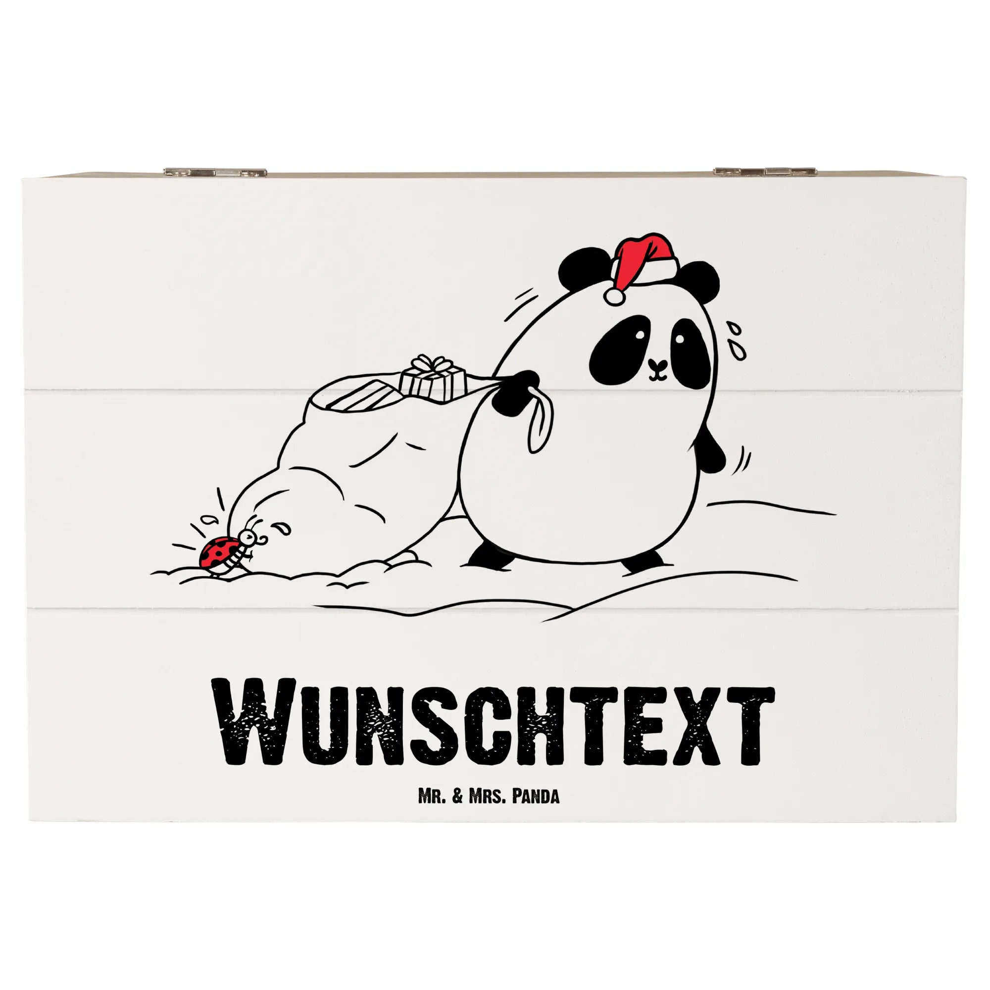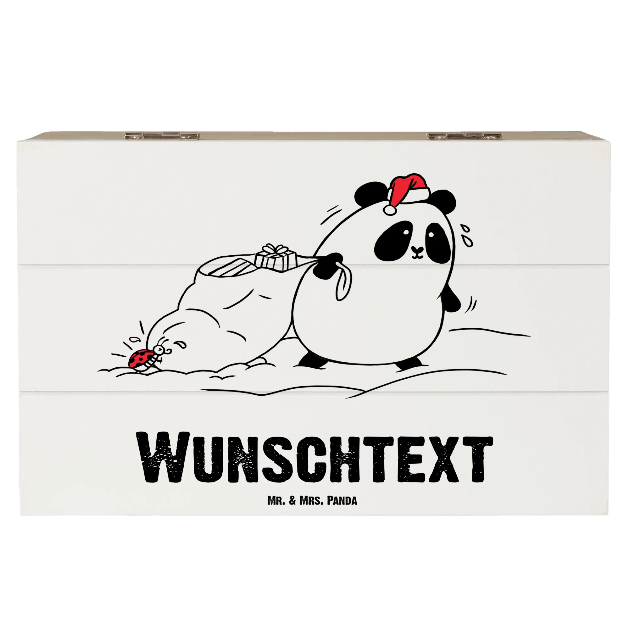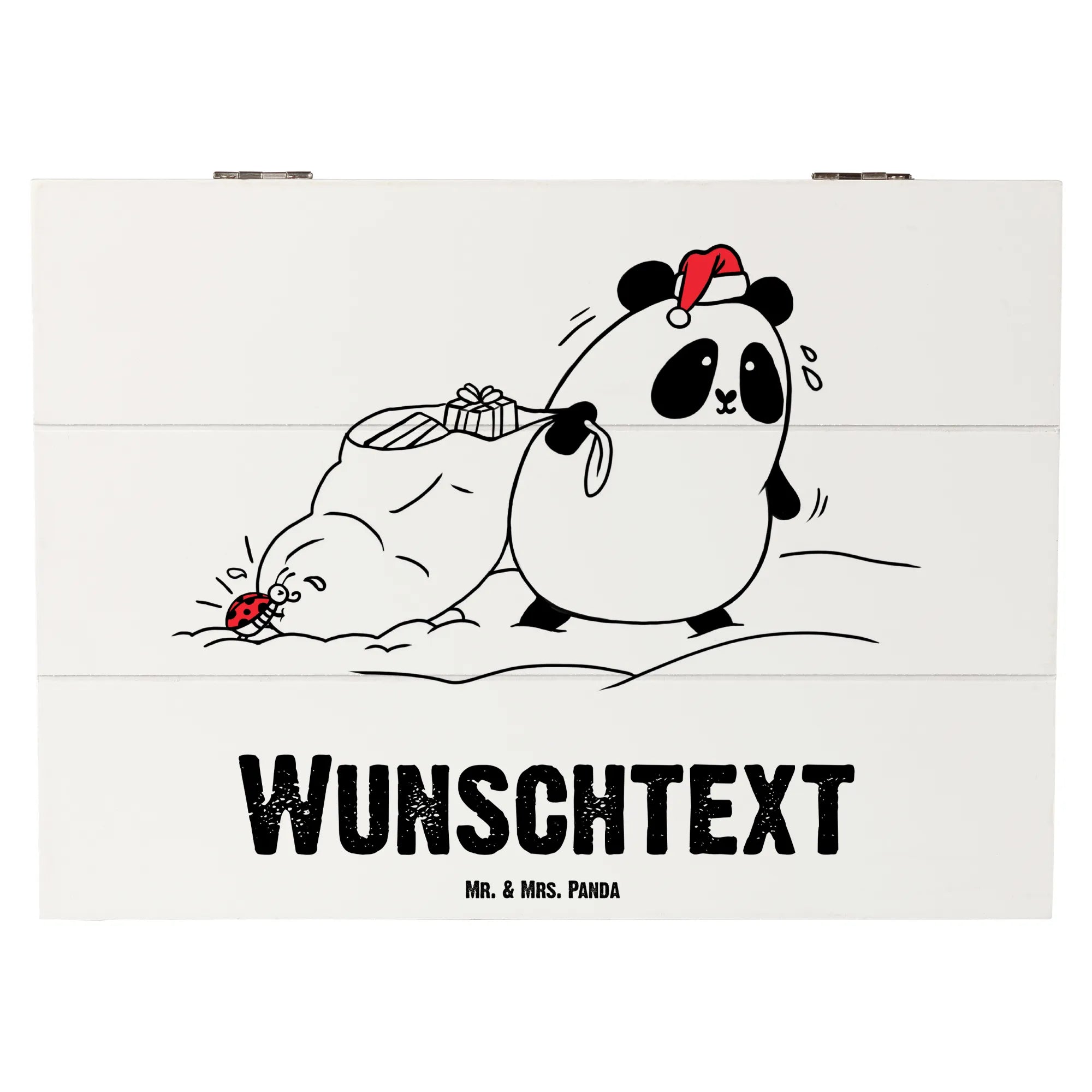 Die Holzkiste kommt mit einem zauberhaften Design: Ein süßer Panda im Nikolauskostüm zieht einen großen Sack voller Geschenke, während ein kleiner Marienkäfer ihm tatkräftig zur Seite steht. Der Spruch "Frohe Weihnachten und viel Glück!" rundet das ganze Bild charmant ab.