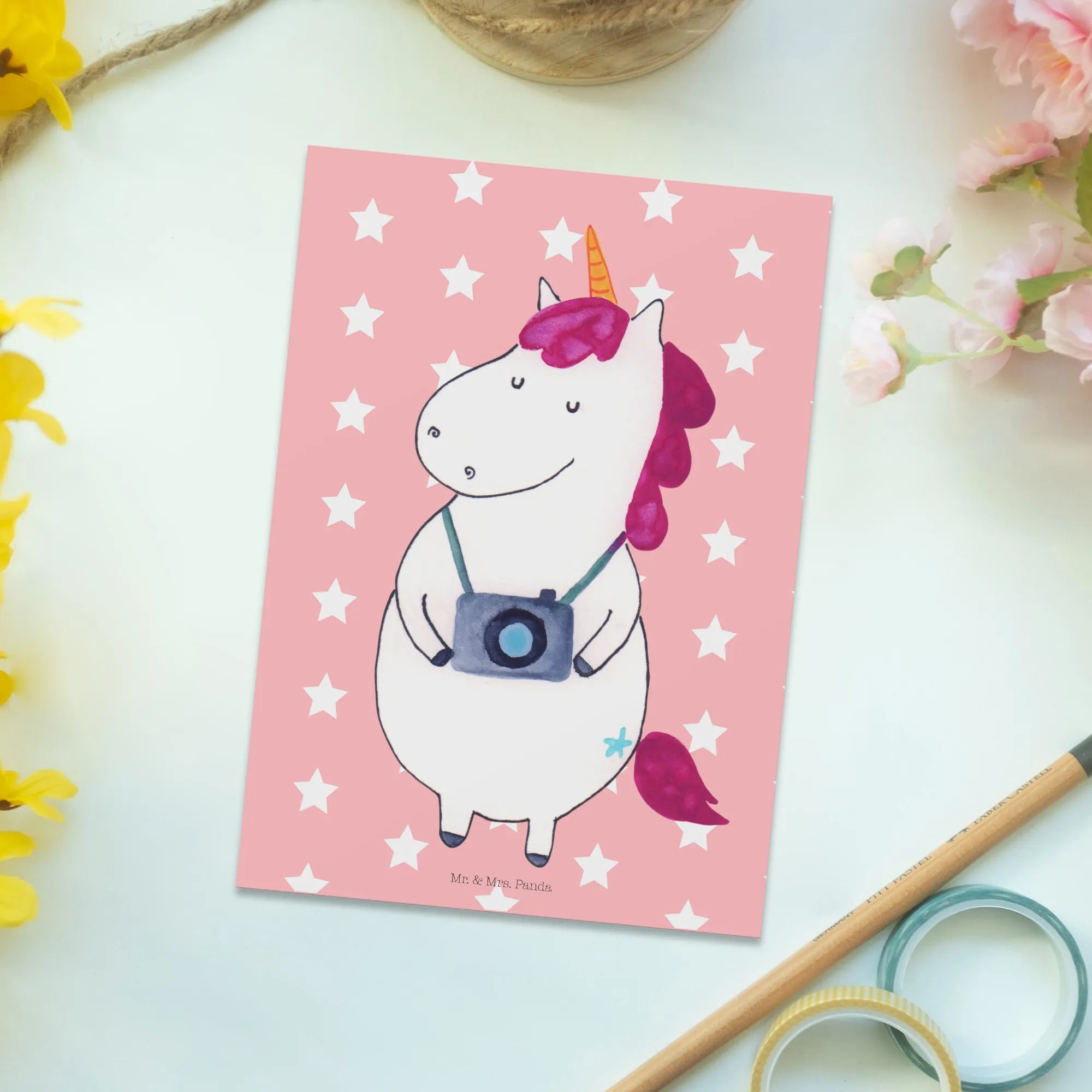 Entdecke die zauberhafte Postkarte mit dem Motiv Einhorn Fotograf aus der Einhorn-Kollektion von Mr. & Mrs. Panda. Diese einzigartige Postkarte ist perfekt für alle, die das Abenteuer Reisen lieben und das Fernweh in ihrem Herzen tragen.