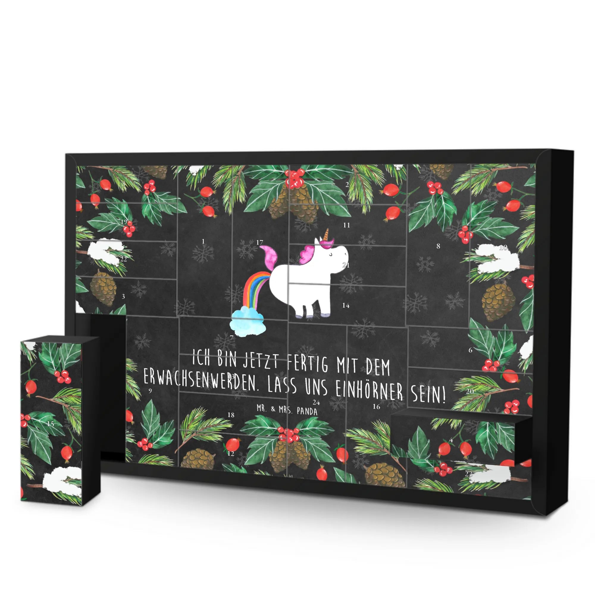 Der befüllbare Adventskalender Einhorn Pupsend von Mr. & Mrs. Panda ist das perfekte Geschenk für alle, die das Kind in sich bewahren möchten und dabei gerne über das Erwachsenwerden schmunzeln.