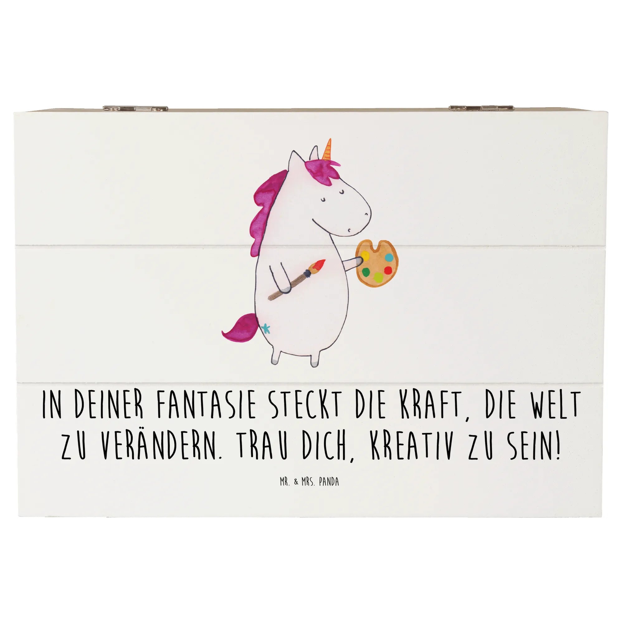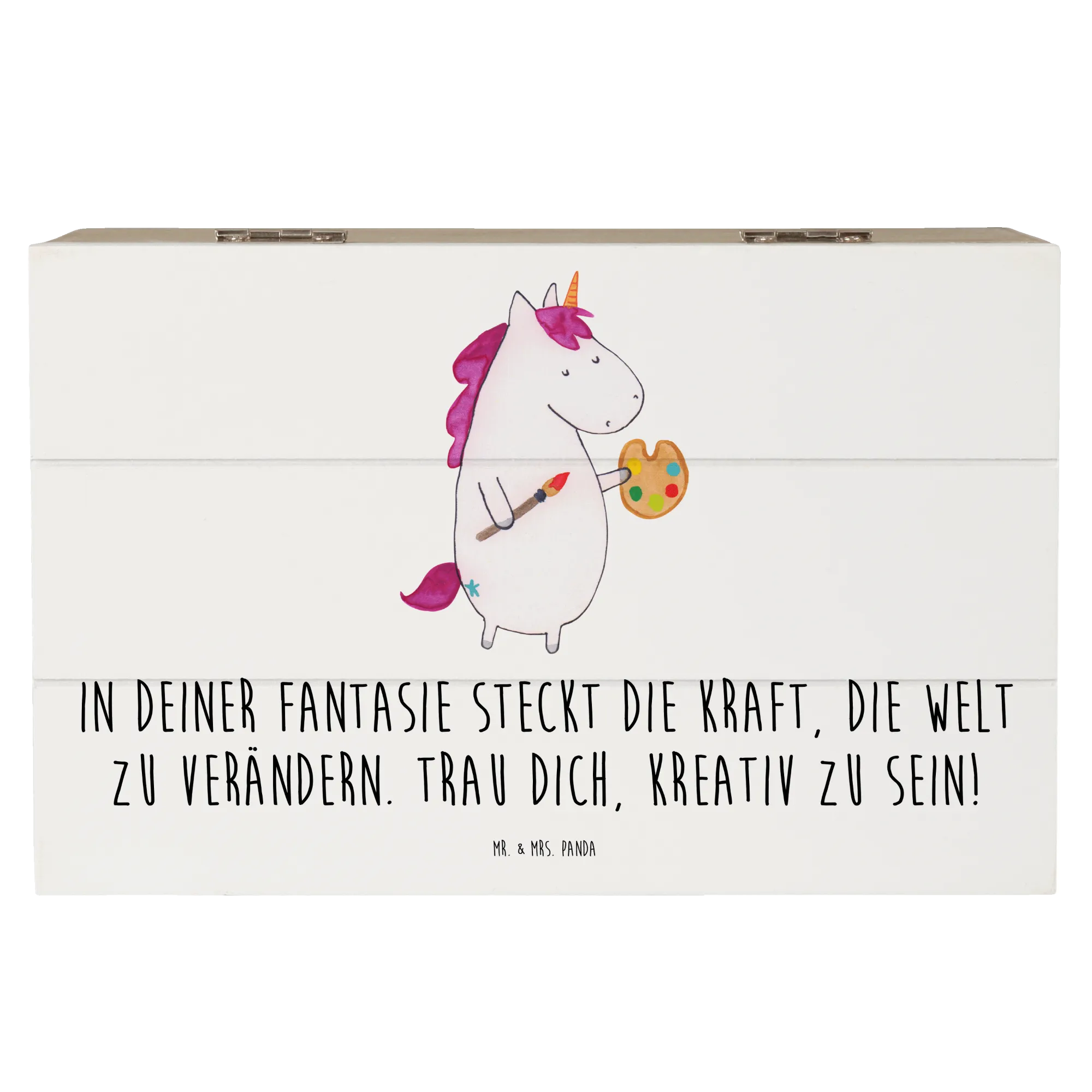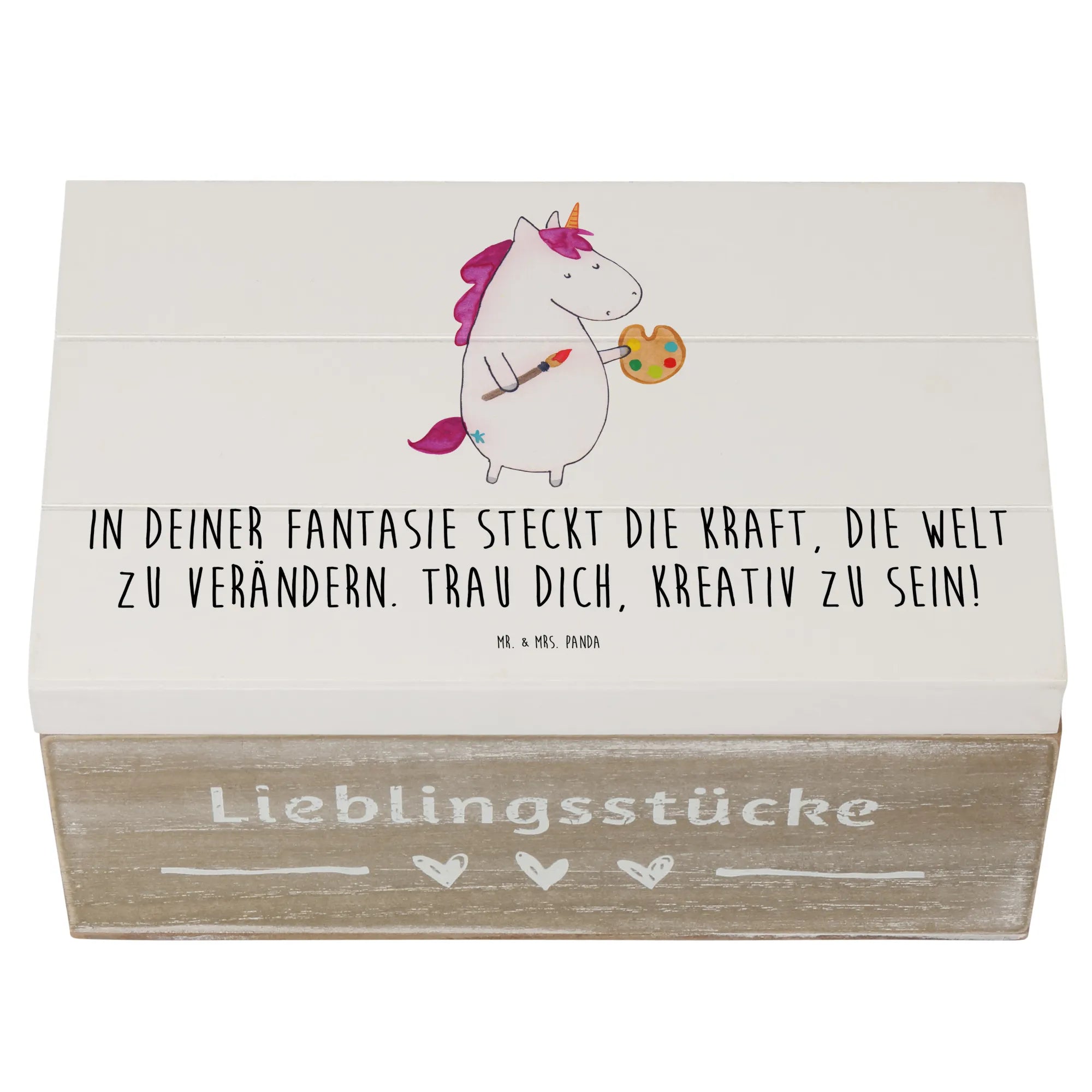 Die Holzkiste „Die Freude an der Kreativität entdecken“ aus der Mutmacher-Kollektion von Mr. & Mrs. Panda ist mehr als nur eine Box. Sie trägt die Botschaft: „In deiner Fantasie steckt die Kraft, die Welt zu verändern. Trau dich, kreativ zu sein!“ und ist damit ein ganz besonderer Begleiter für alle, die Ermutigung und Platz für ihre Schätze suchen.