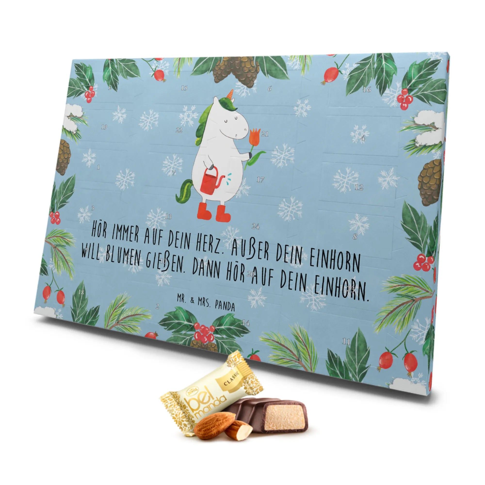 Der zauberhafte Marzipan Adventskalender Einhorn Gärtner von Mr. & Mrs. Panda ist das perfekte Geschenk für alle Einhorn-Liebhaber und Gartenfreunde! Mit seinem liebevollen Design und der Botschaft "Hör immer auf dein Herz. Außer dein Einhorn will Blumen gießen. Dann hör auf dein Einhorn." zaubert er jedem ein Lächeln ins Gesicht.
