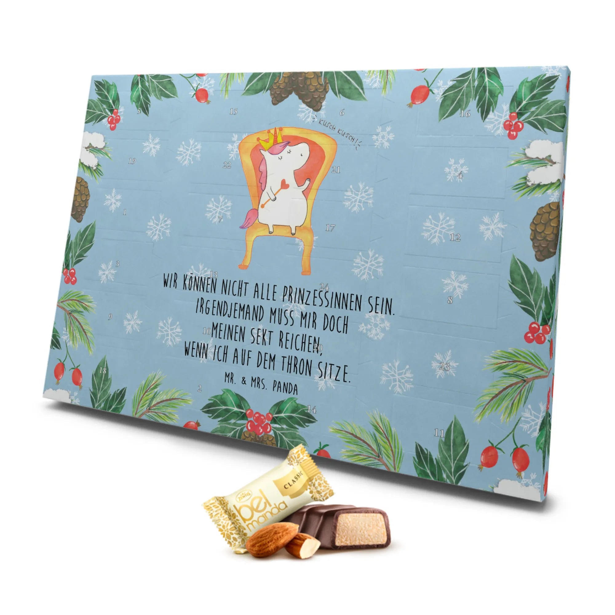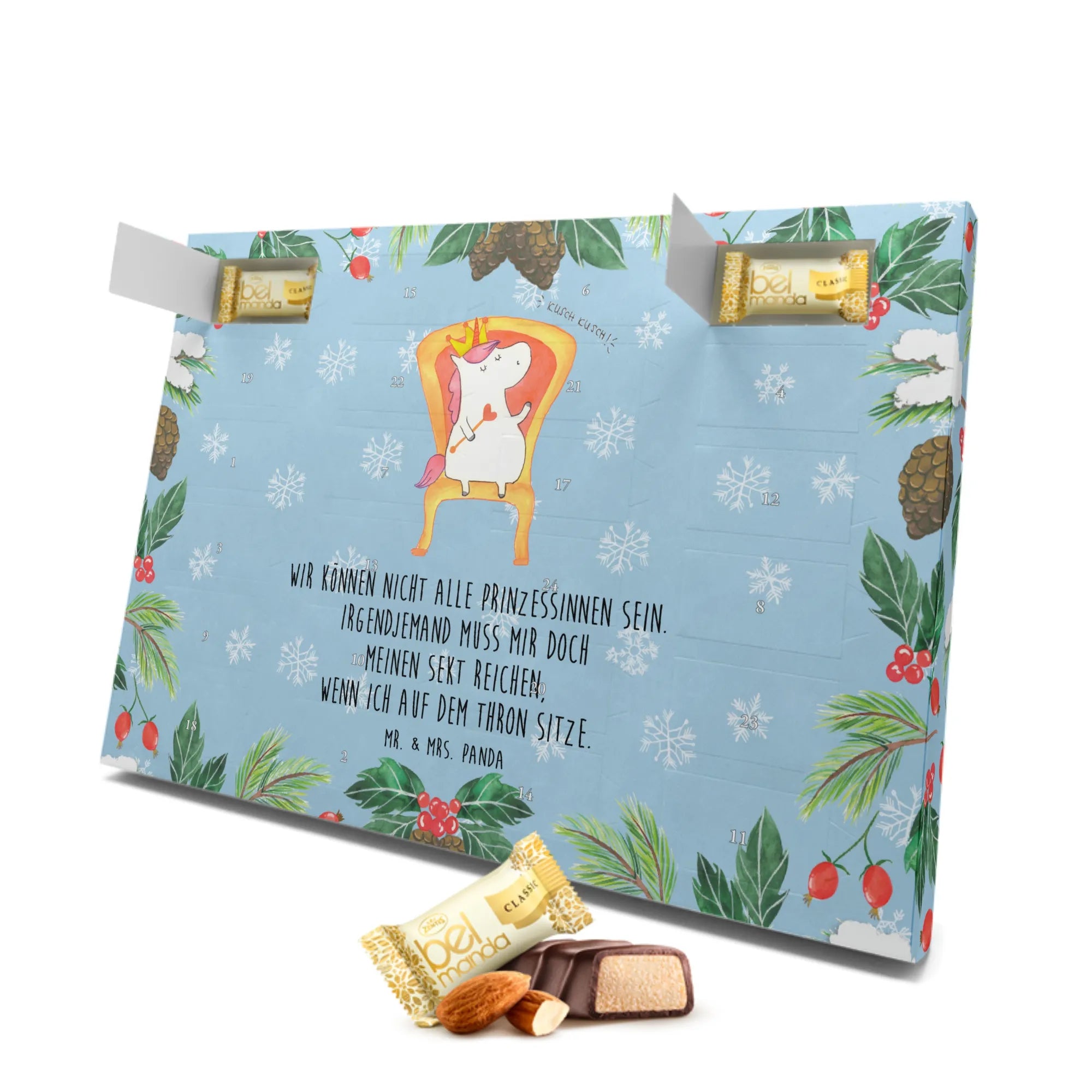 Der wunderschöne Marzipan Adventskalender Einhorn König von Mr. & Mrs. Panda ist das perfekte Geschenk für alle Einhornliebhaber und Prinzessinnen in deinem Leben! Ob für die beste Freundin, die Schwester oder sogar für dich selbst – dieser Adventskalender verzaubert mit einem süßen Einhorn-Motiv und einem humorvollen Spruch: 'Wir können nicht alle Prinzessinnen sein. Irgendjemand muss mir doch meinen Sekt reichen, wenn ich auf dem Thron sitze.' Dieser Spruch bringt jeden zum Schmunzeln und lässt die Vorfreude auf die Weihnachtszeit steigen.